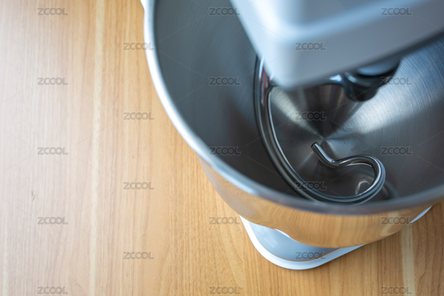 攪拌機(jī)的特寫鏡頭展示金屬攪拌碗和攪拌鉤