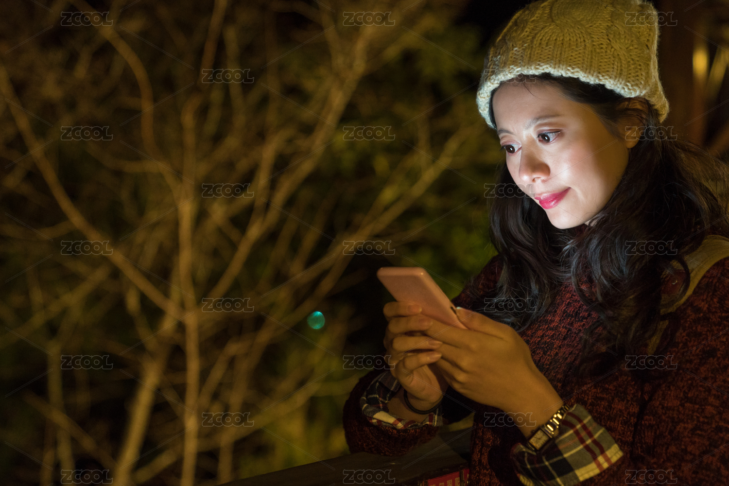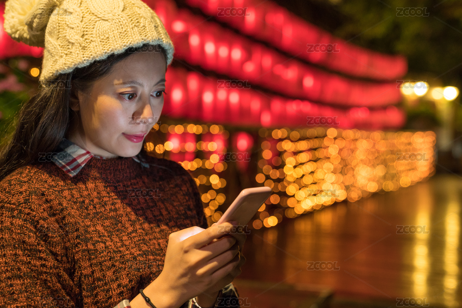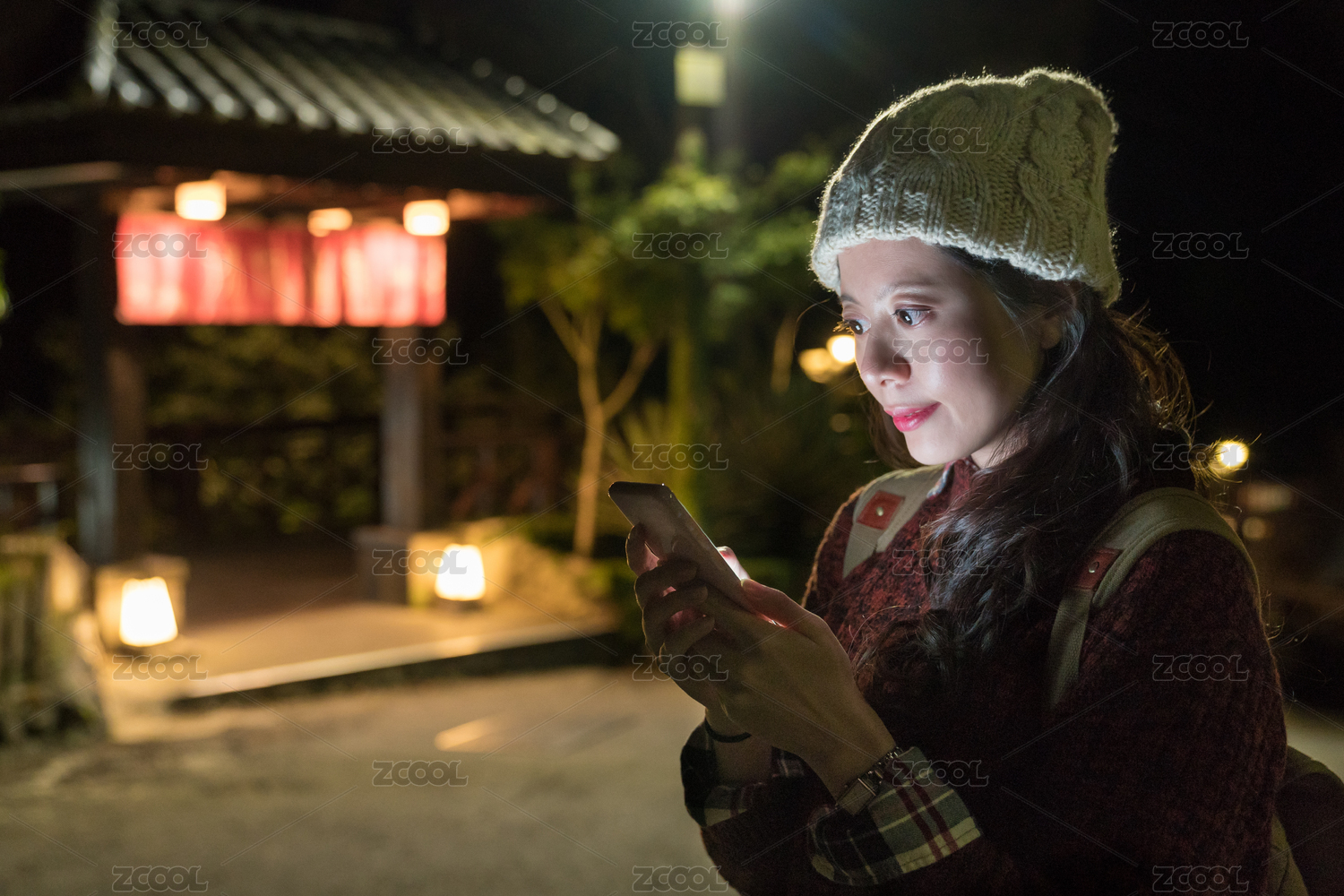 迷人的亞洲女孩使用移動(dòng)智能手機(jī)在晚上的時(shí)間與朋友分享日本旅游??信息。