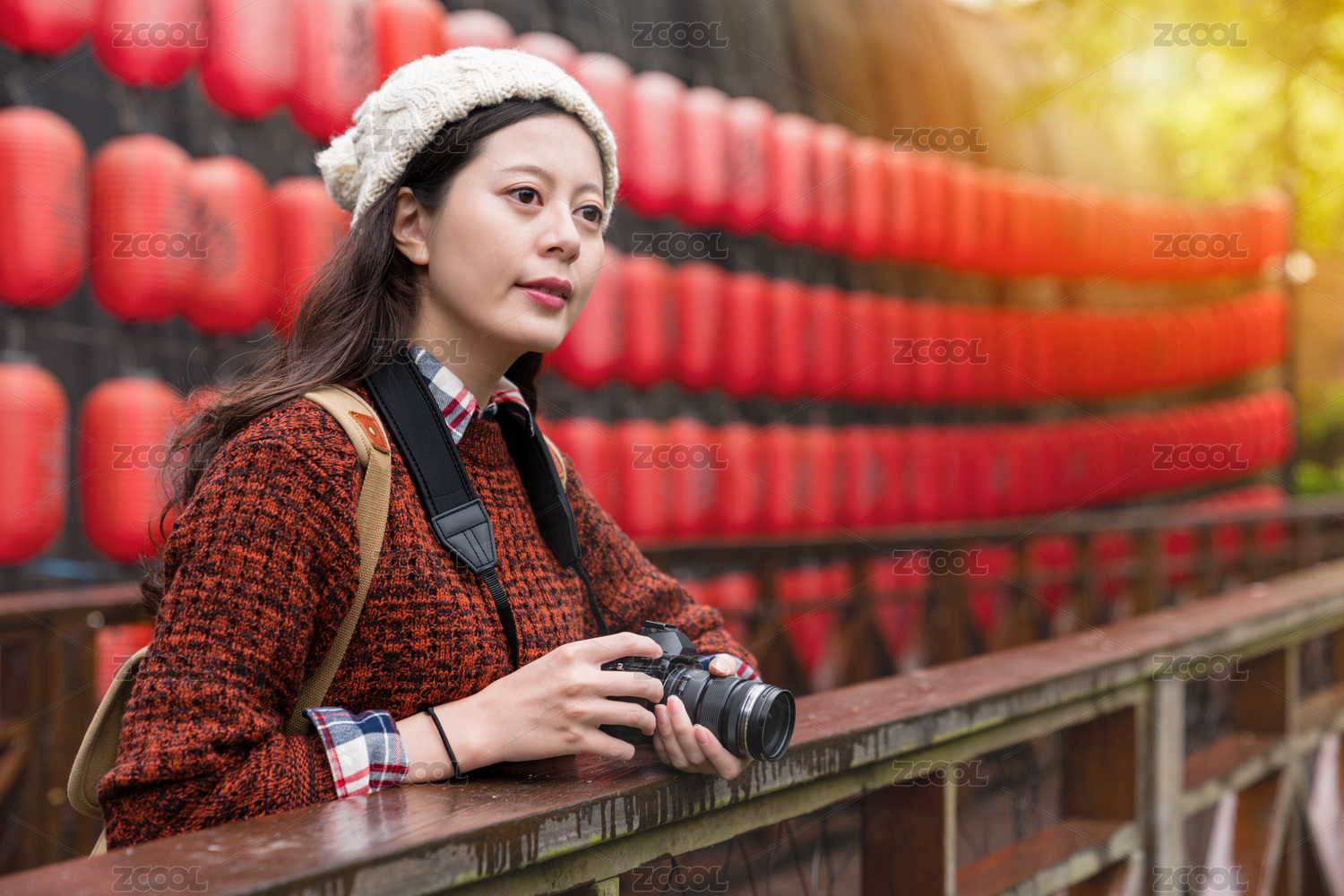 年輕的亞洲女孩享受日本紅燈籠,步行到遠(yuǎn)遠(yuǎn)看去戶外景色。