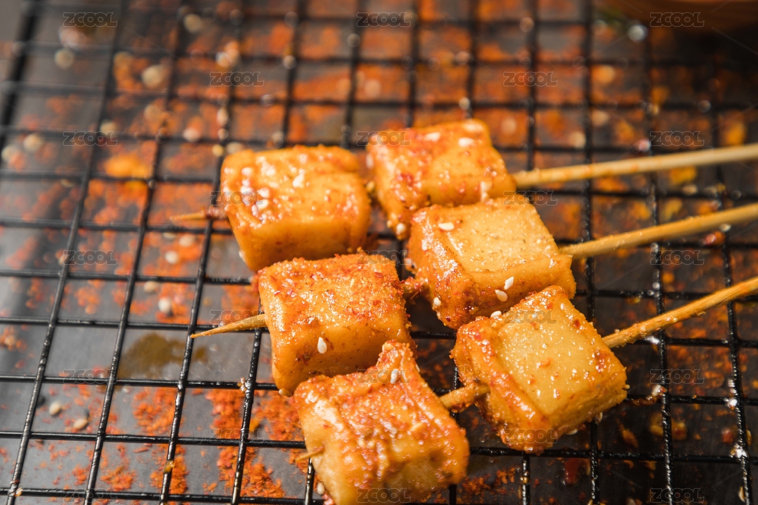 黑色烤架上放著幾串撒著辣椒面油炸魚豆腐