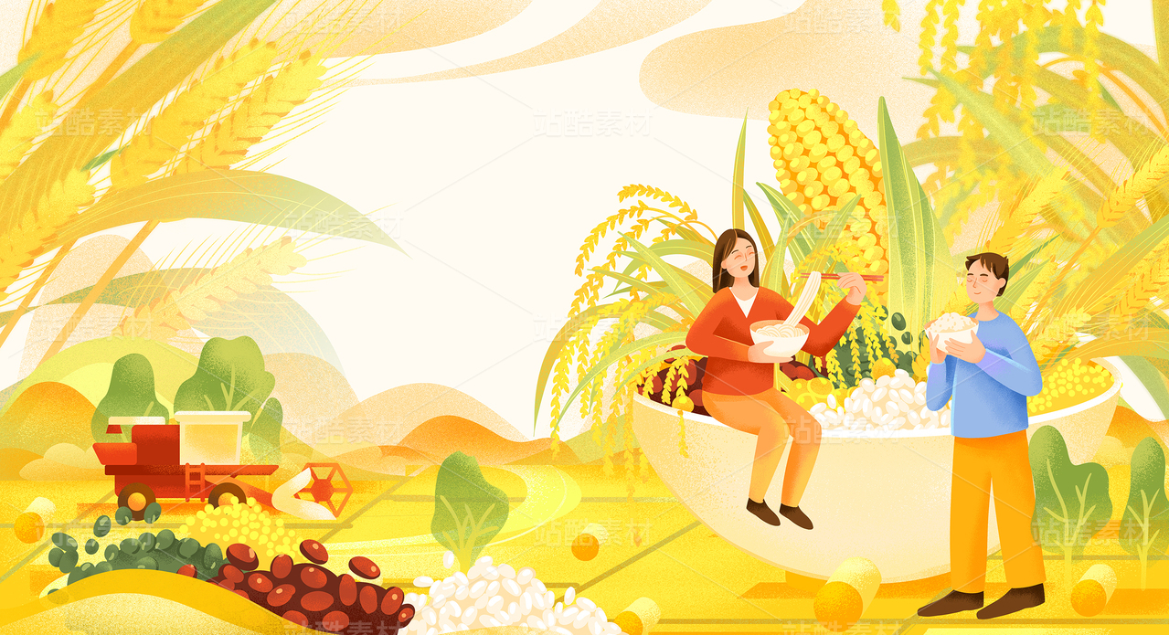 世界糧食日男女吃飯谷物農(nóng)田豐收麥穗稻穗碗糧食插畫
