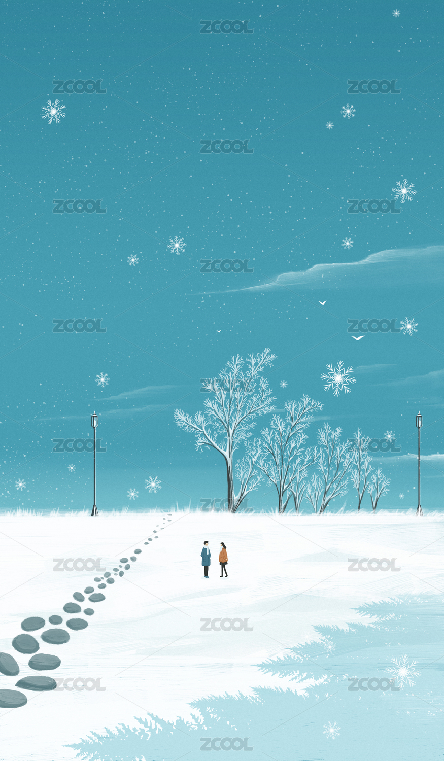 冬季雪地里散步的情侶文藝插畫豎