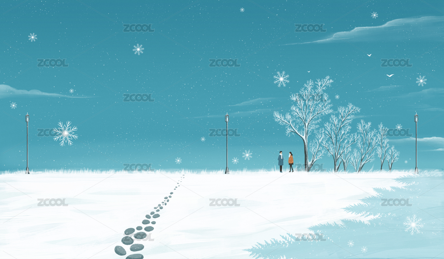 冬季雪地里散步的情侶文藝插畫橫