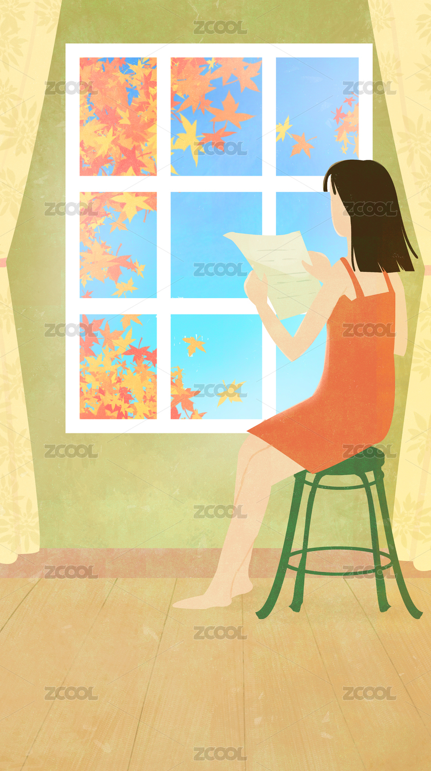深秋窗邊一個懷情少女在讀信文藝插畫