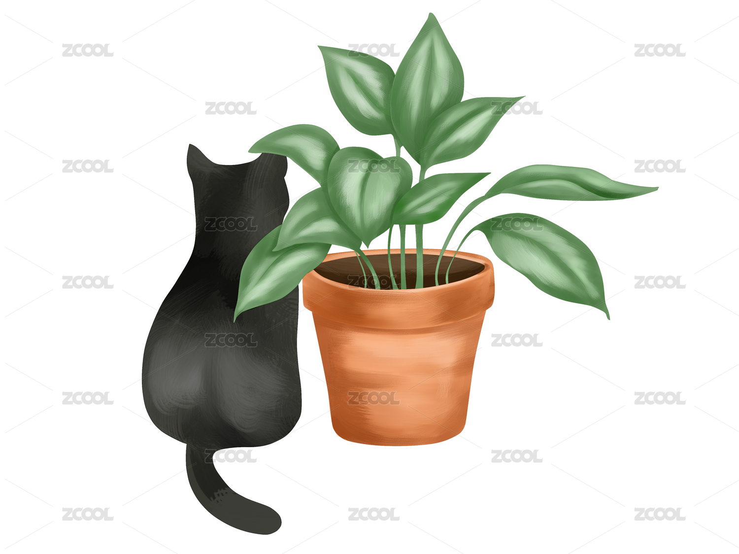 一只黑色貓咪蹲在一盆綠色植物旁文藝插畫素材