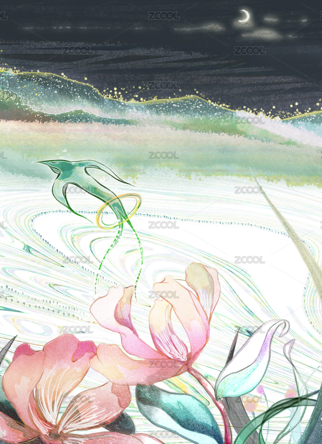 植物環(huán)繞的月亮從天而落進山谷的文藝插畫
