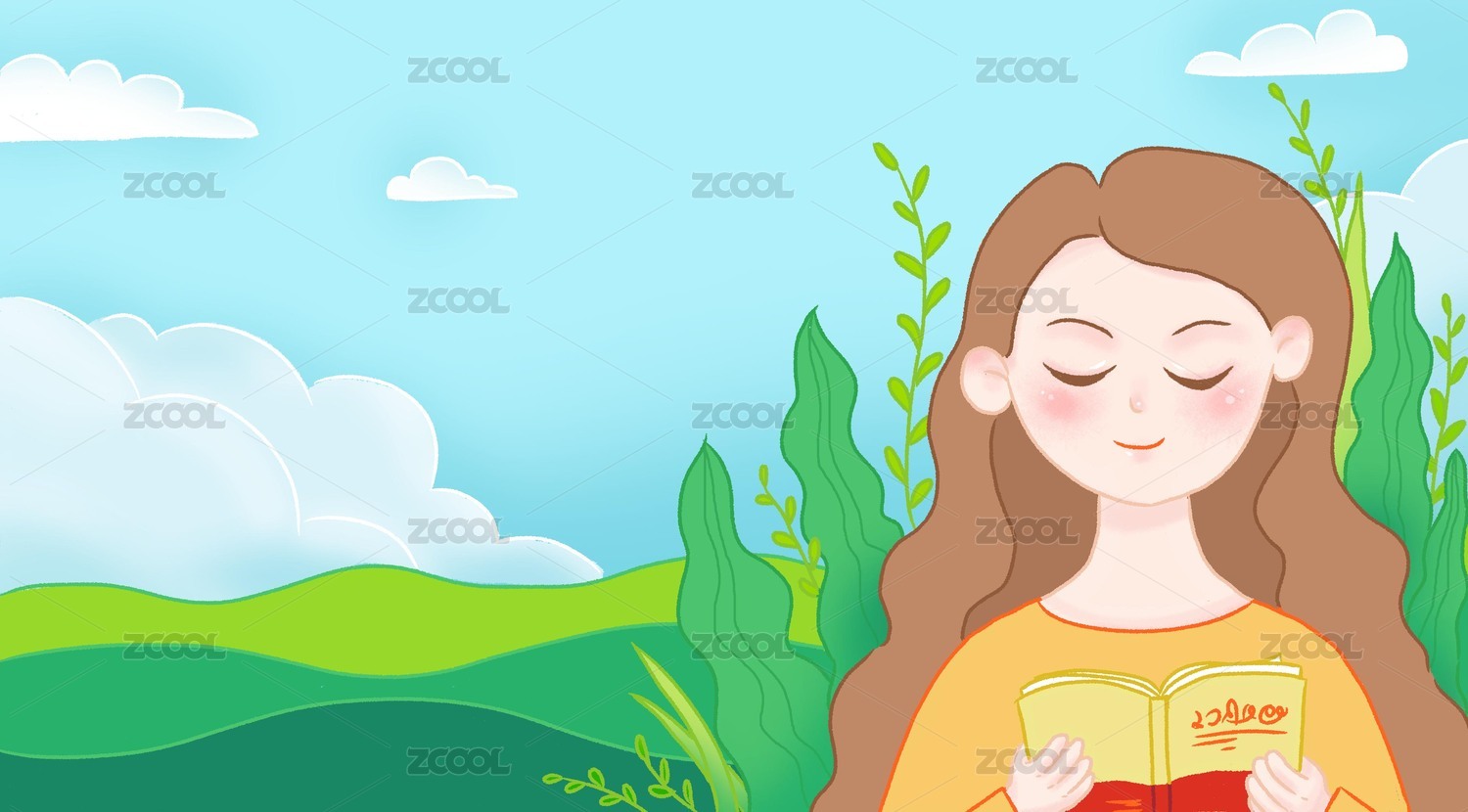 藍天白云看書的女孩手繪清新文藝插畫