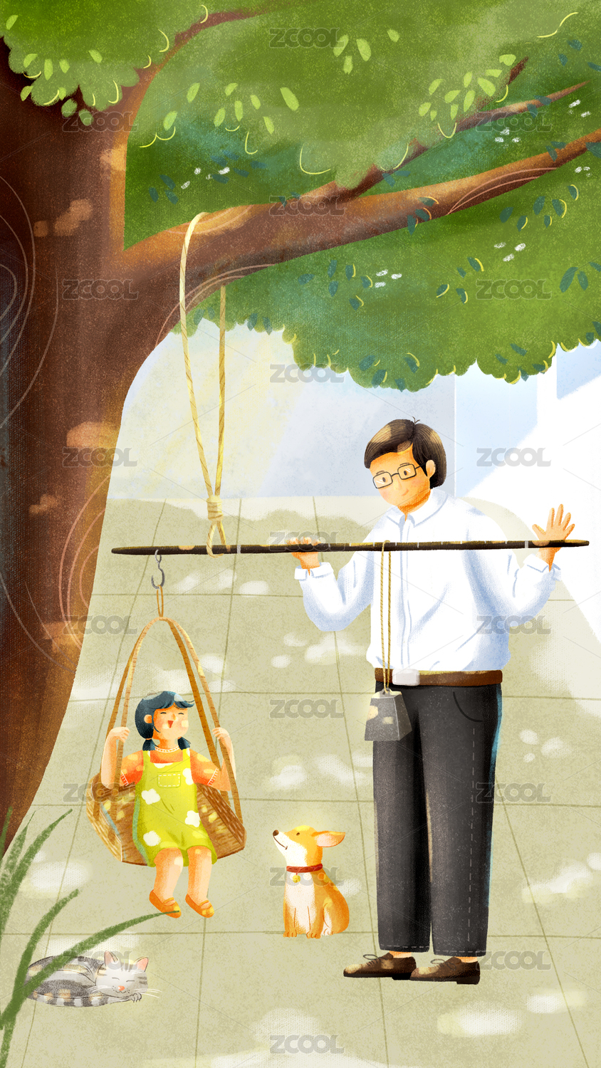 爸爸在樹(shù)下給小女孩稱重
