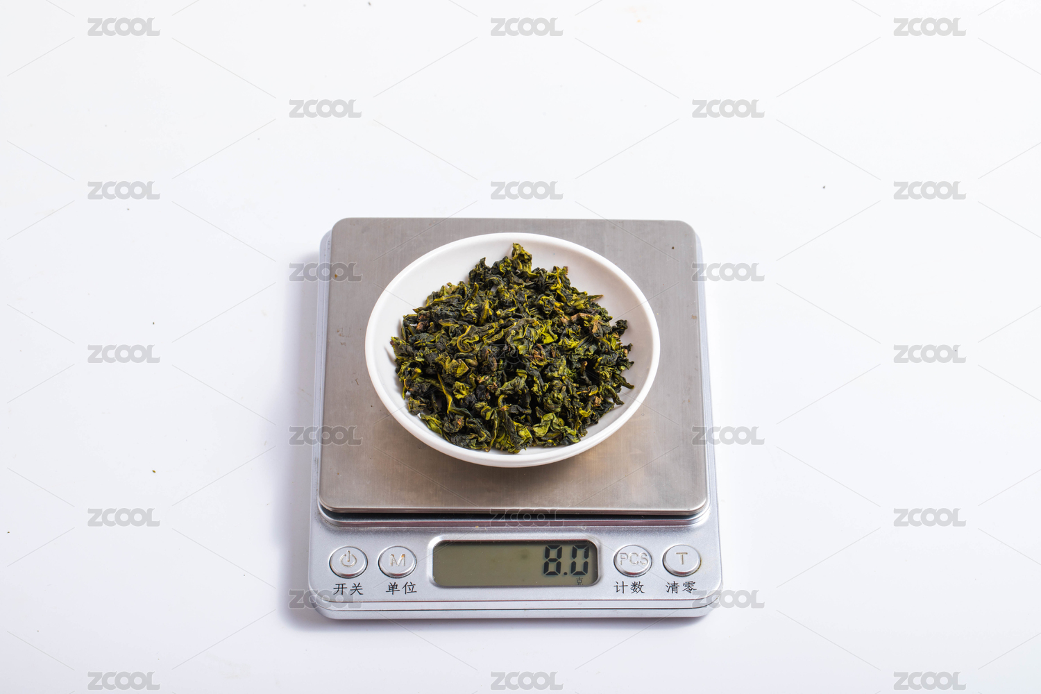 用白瓷碗裝著的桂花烏龍放在電子稱上稱重