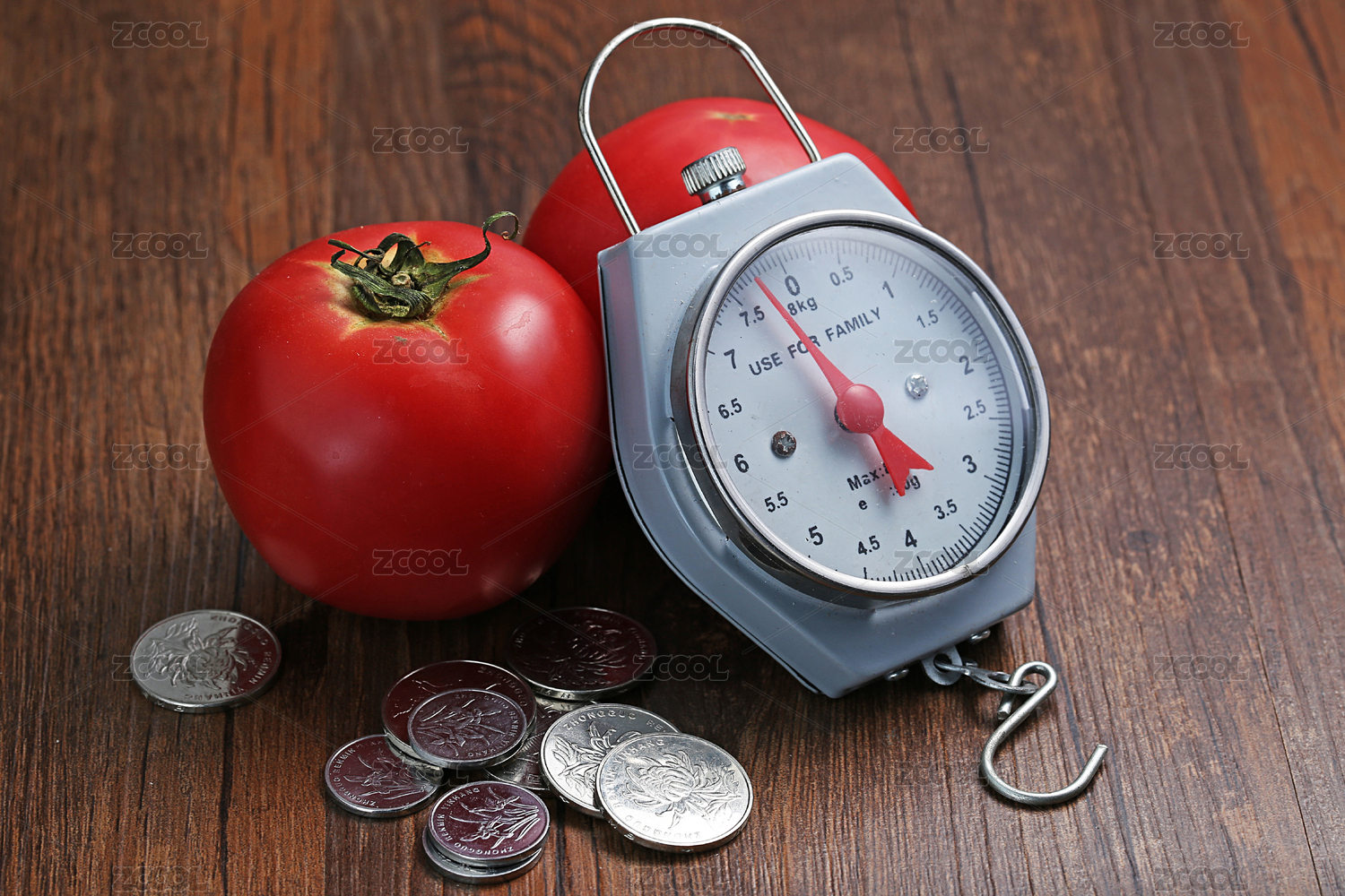 西紅柿、稱重器和硬幣在木板上