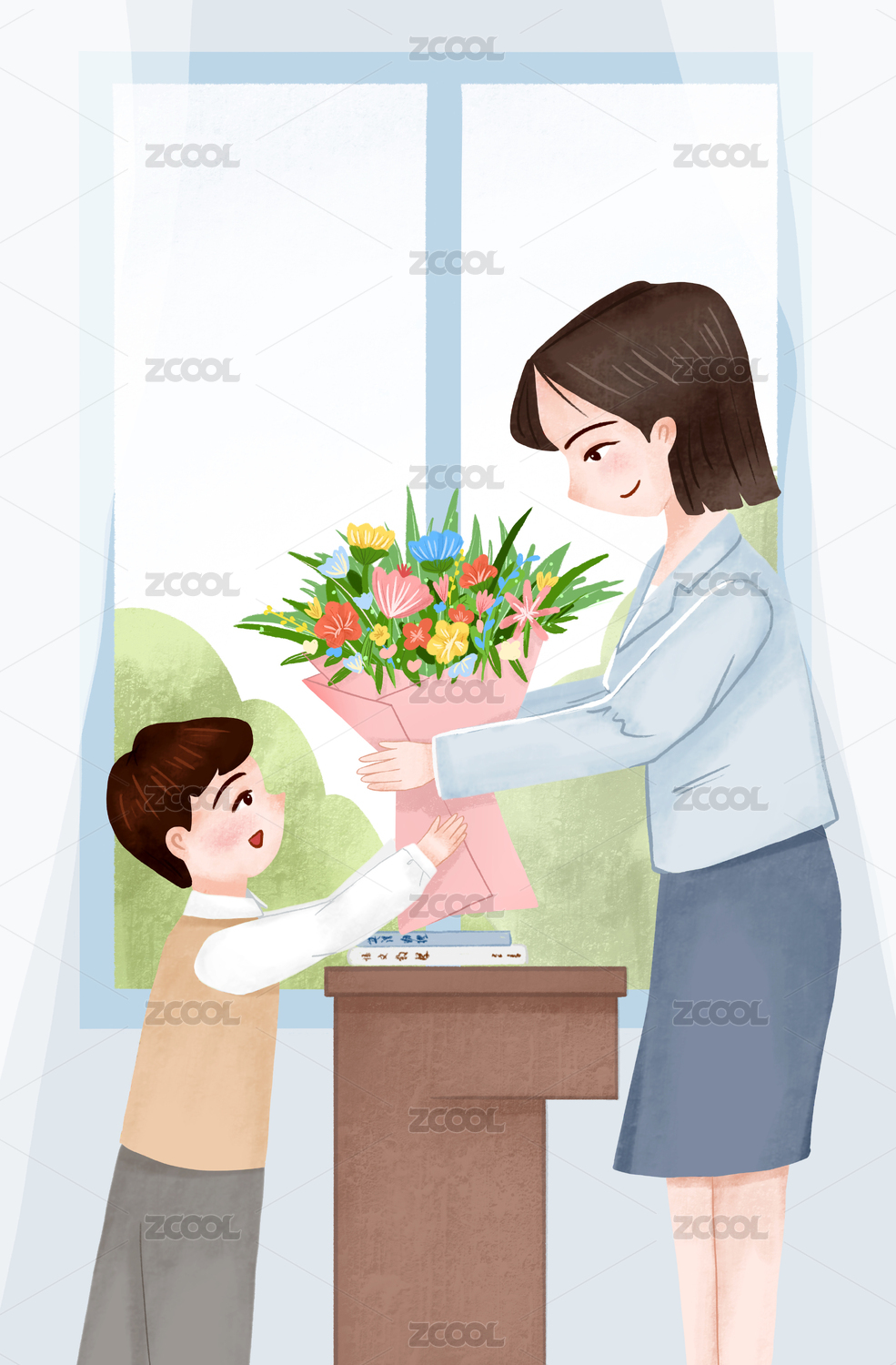 學生向老師獻花感謝師恩教師節(jié)手繪插畫