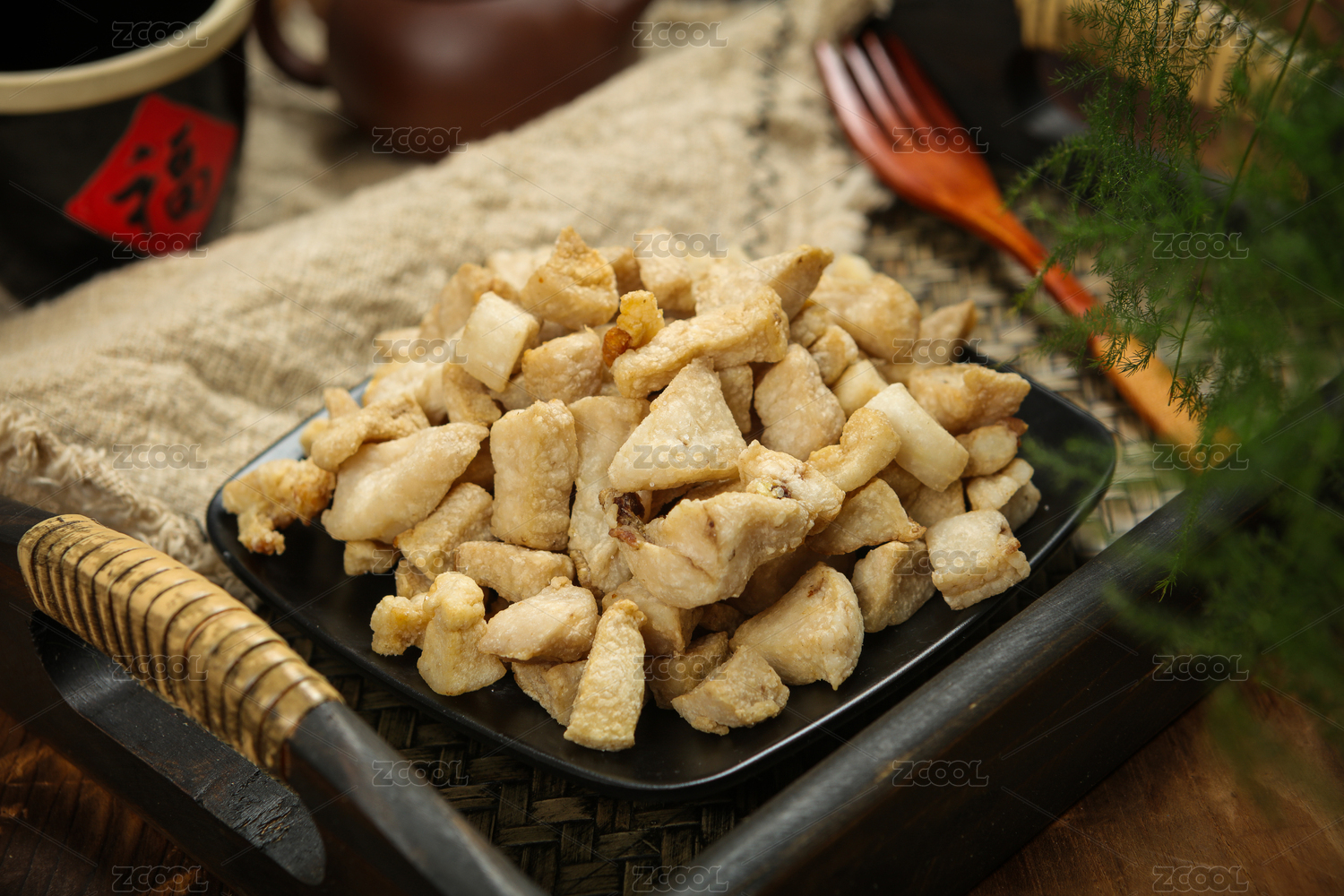 中式菜肴盤(pán)子中的香酥油炸豬皮