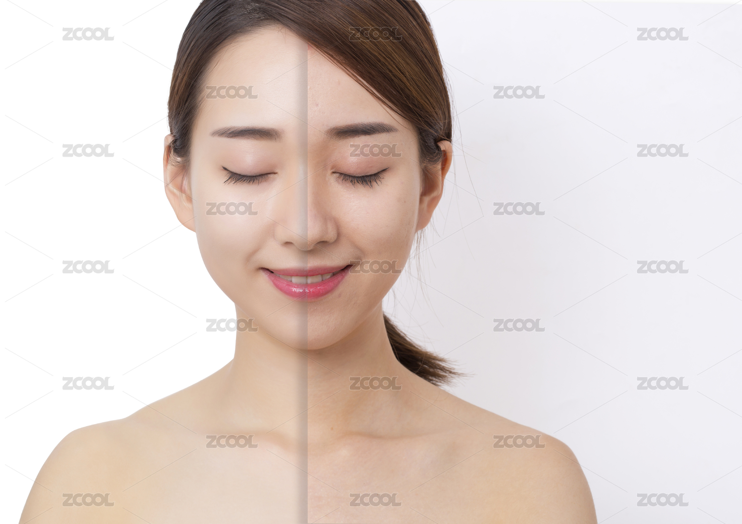年輕的女性和改變的皮膚,光滑的皮膚和粗糙的皮膚對比,前后改變