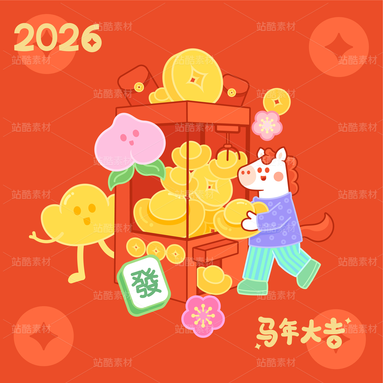馬年春節(jié)恭喜發(fā)財(cái)娃娃機(jī)金元寶桃子卡通矢量插畫(huà)