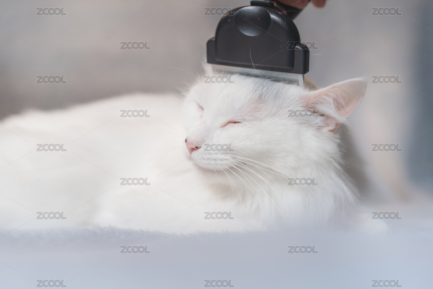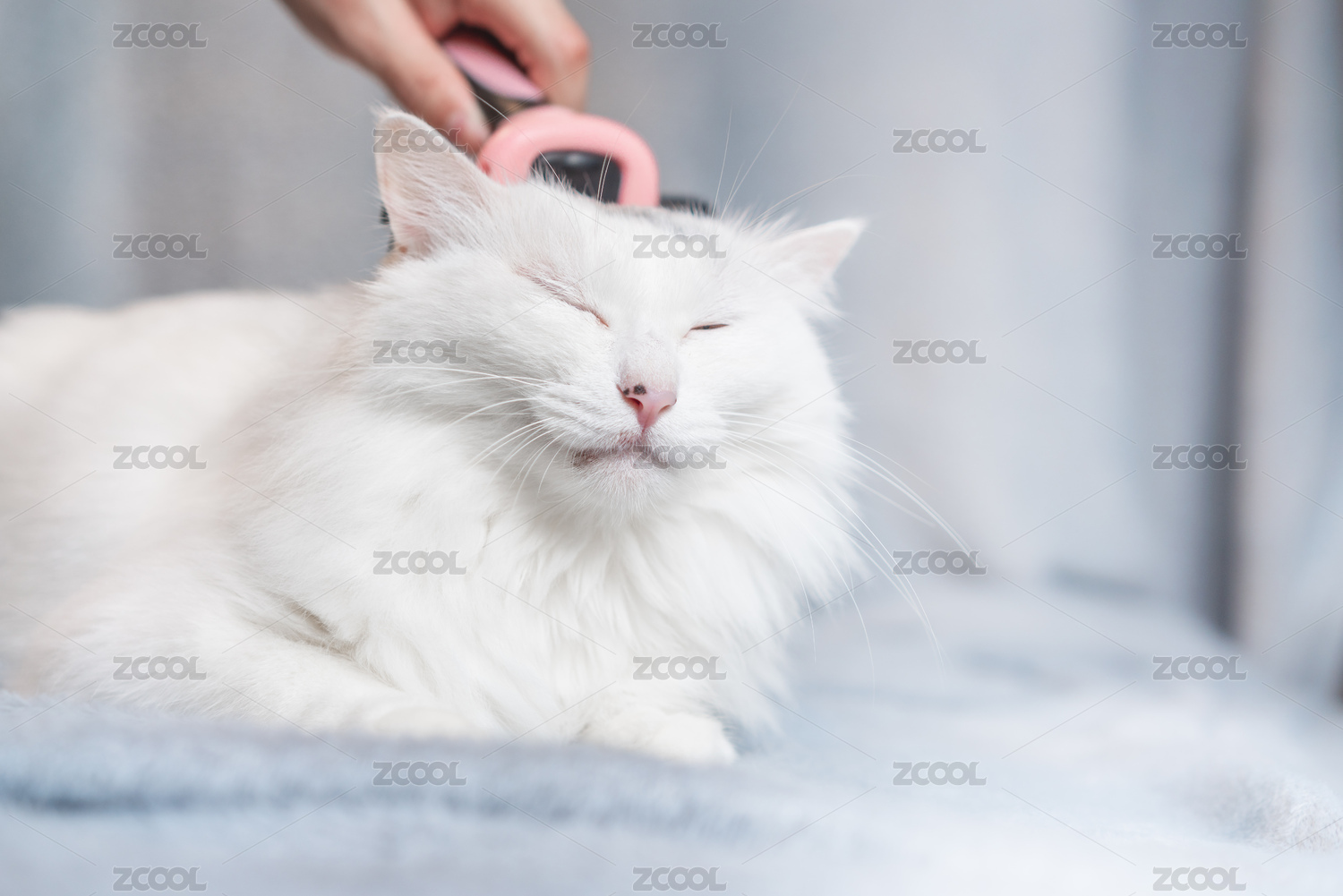 一只手拿著梳子正在給沙發(fā)上的貓咪梳毛