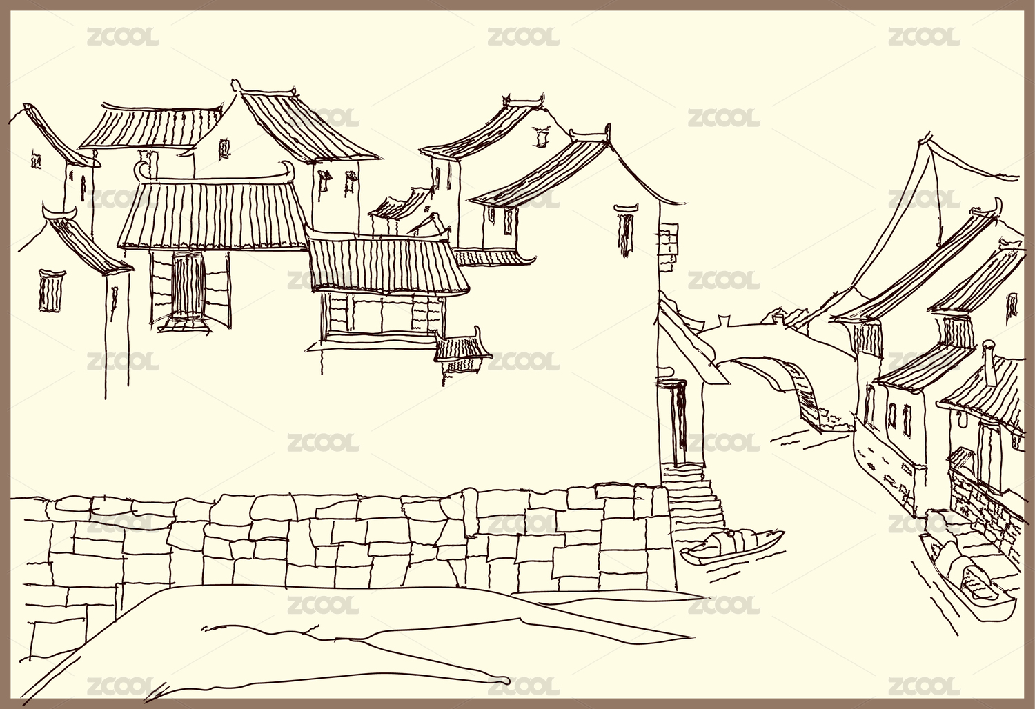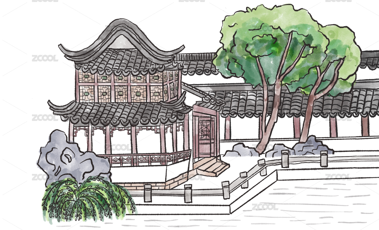蘇州古鎮(zhèn)園林速寫(xiě)手繪線稿矢量