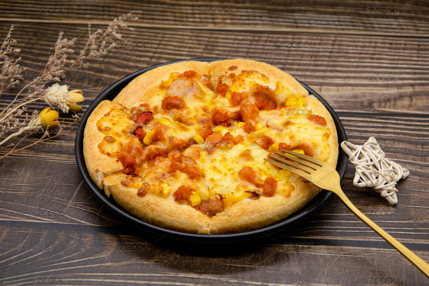 木桌背景一盤西式披薩