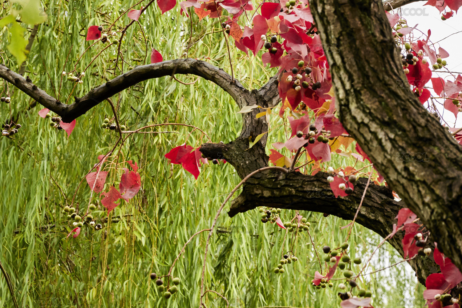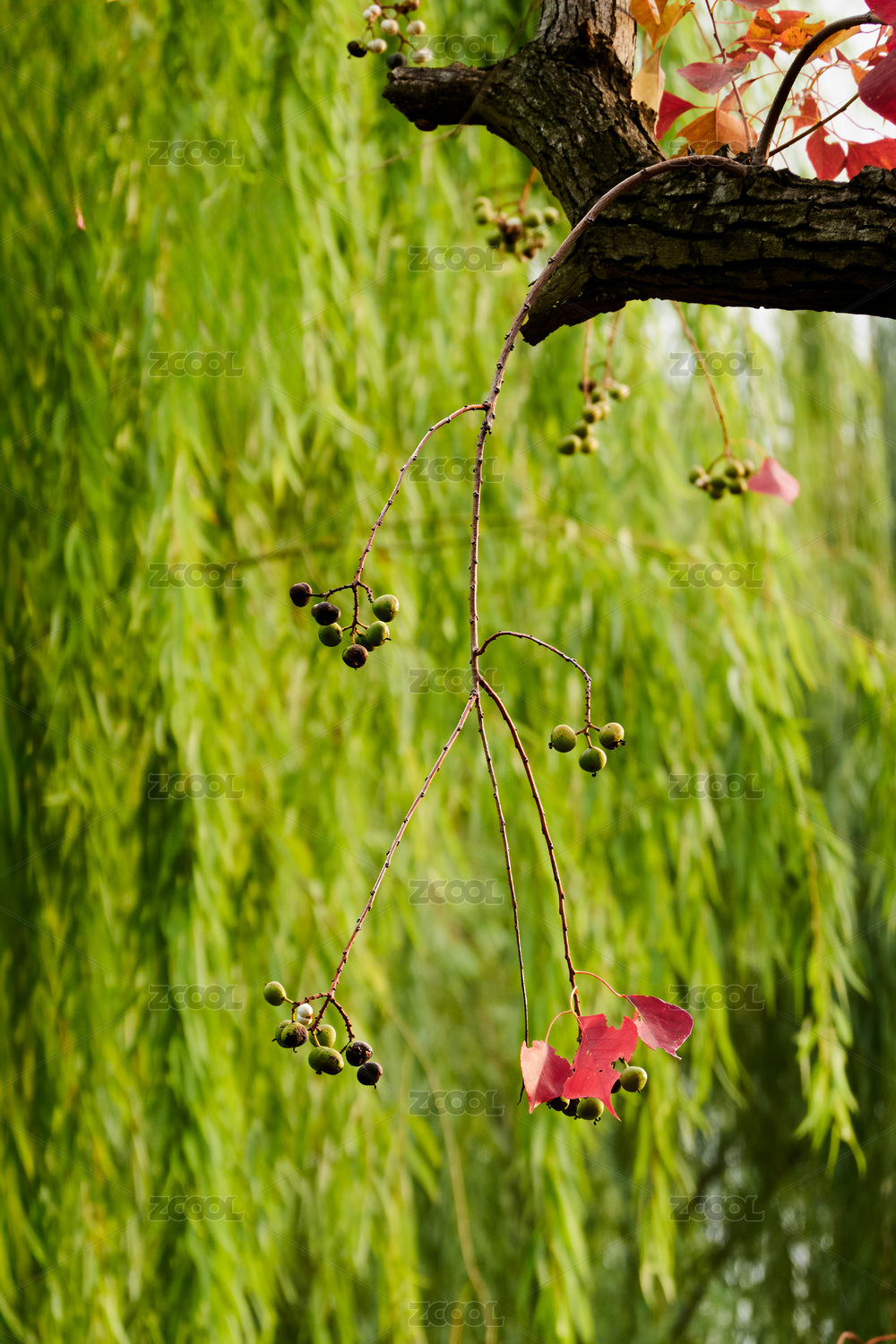 紅葉烏桕枝條垂掛在翠綠柳林前