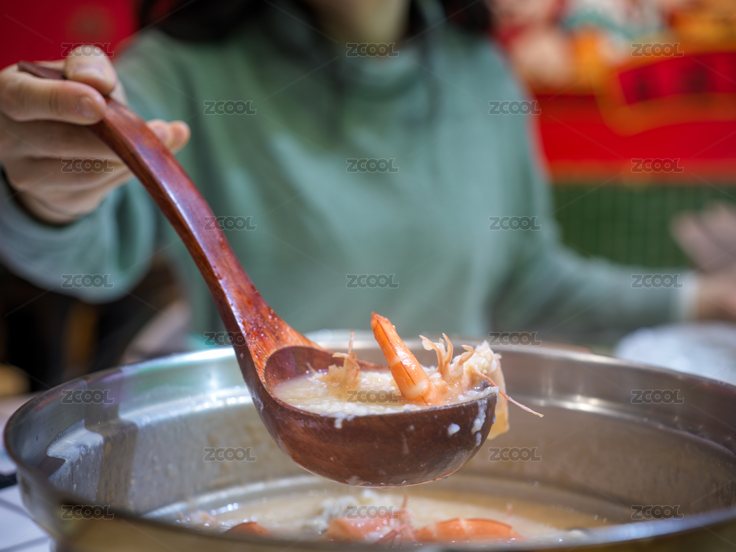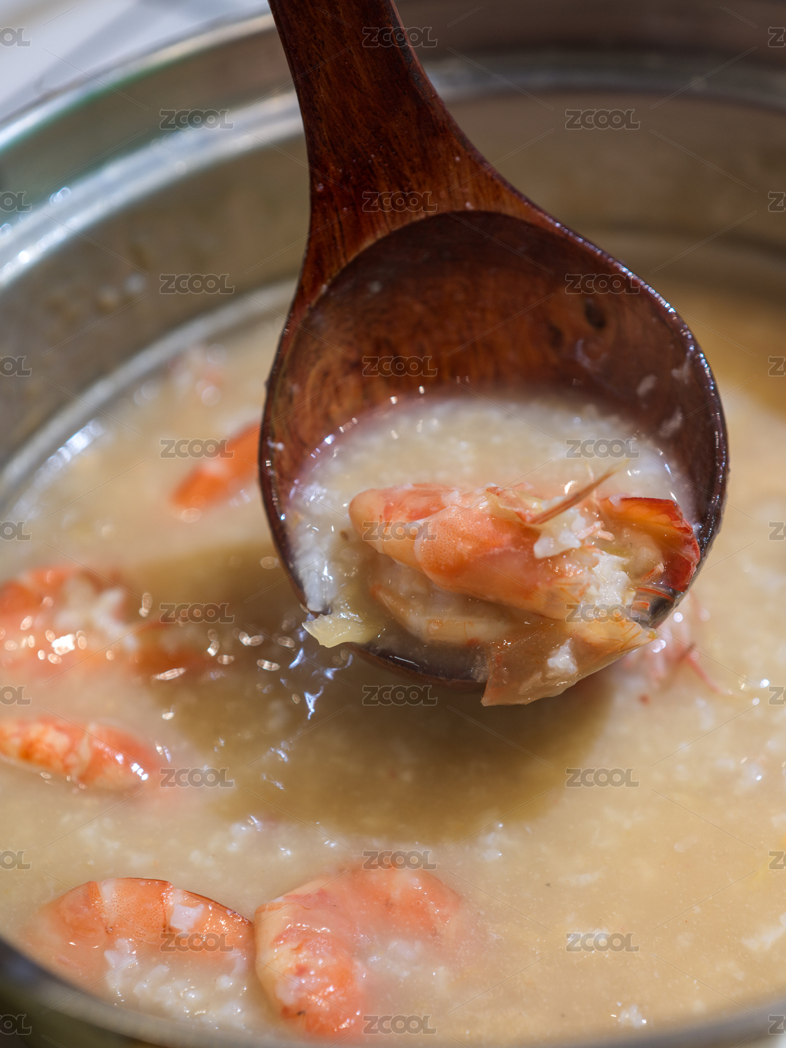 木勺舀起的鮮蝦粥