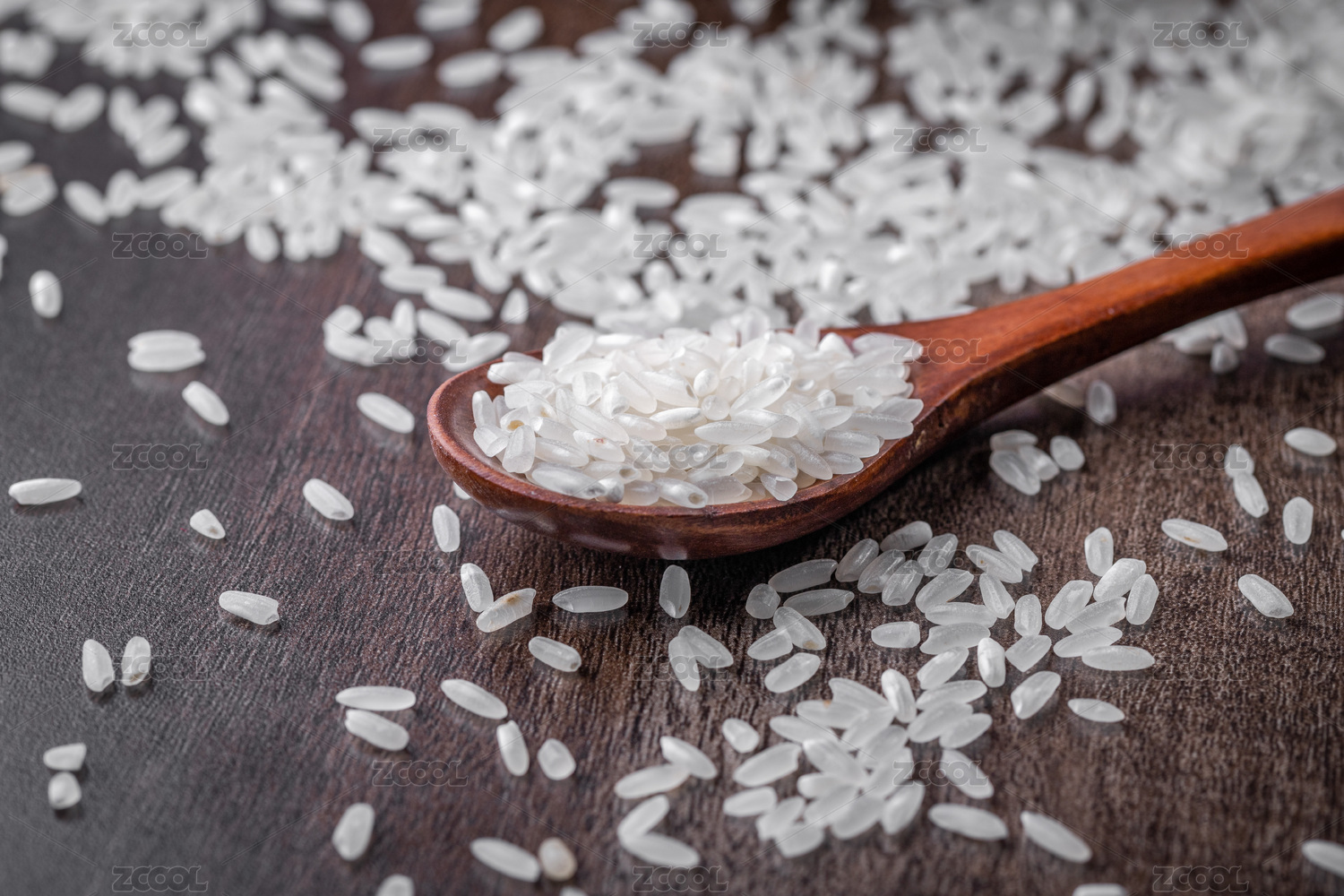 棕色木紋桌上放著一些大米和木勺