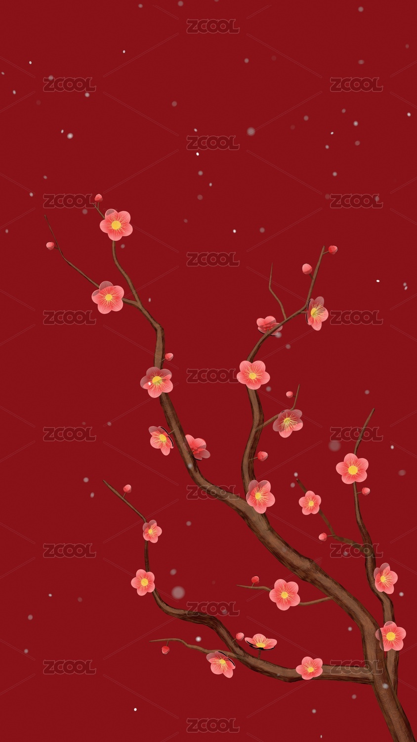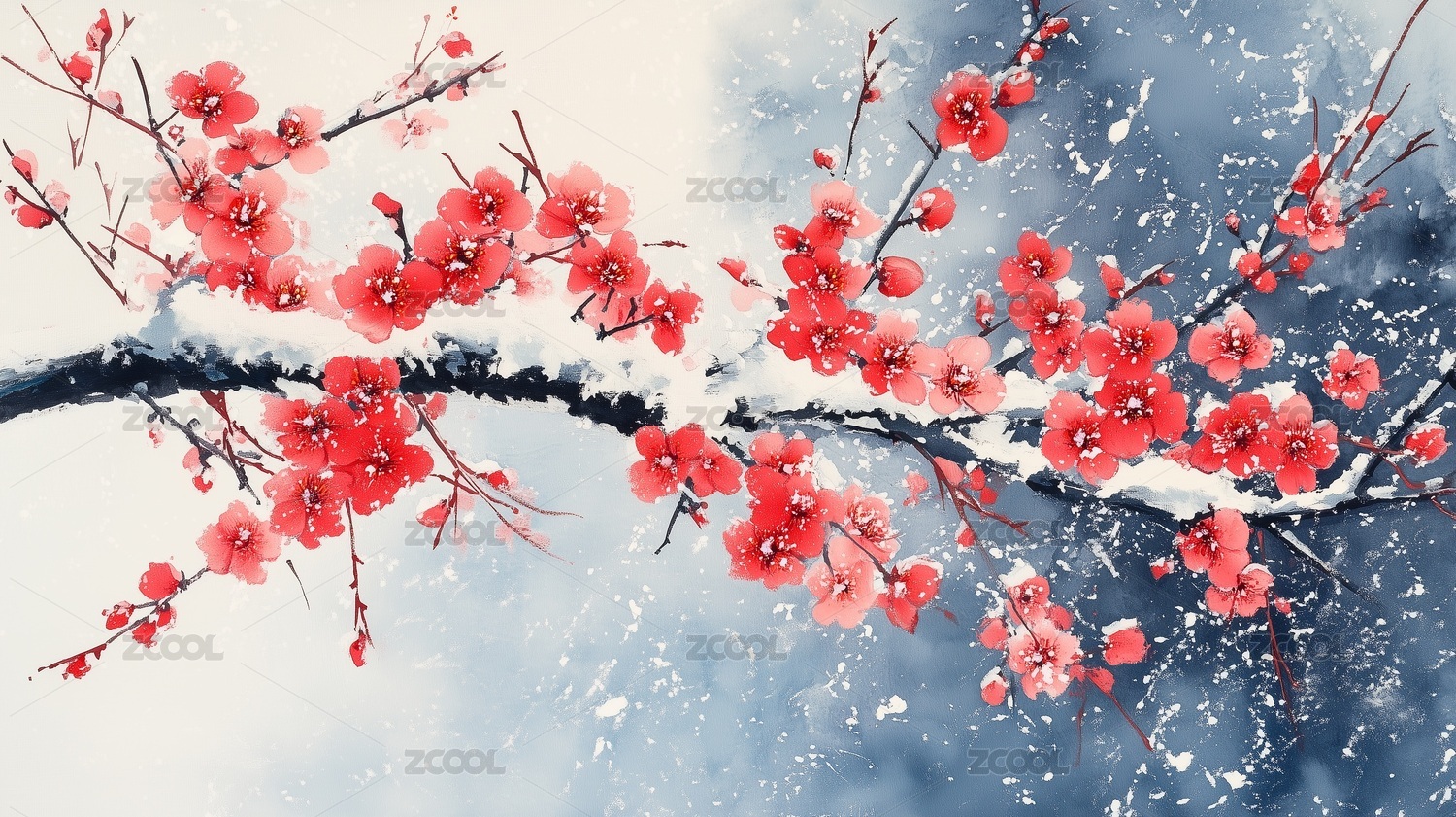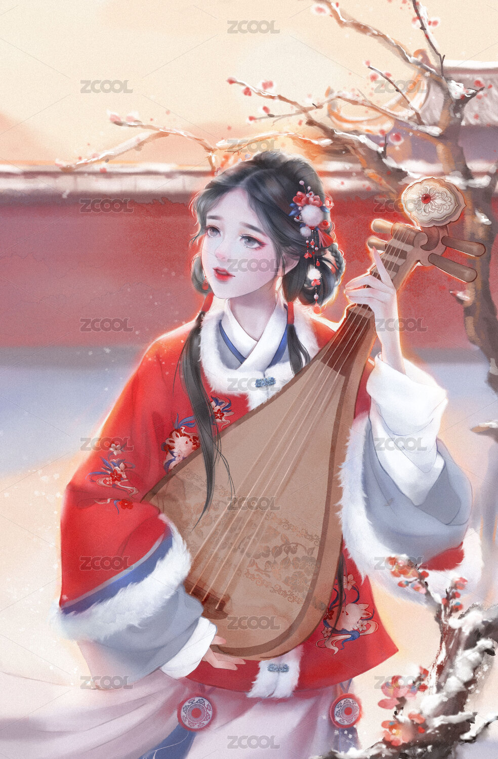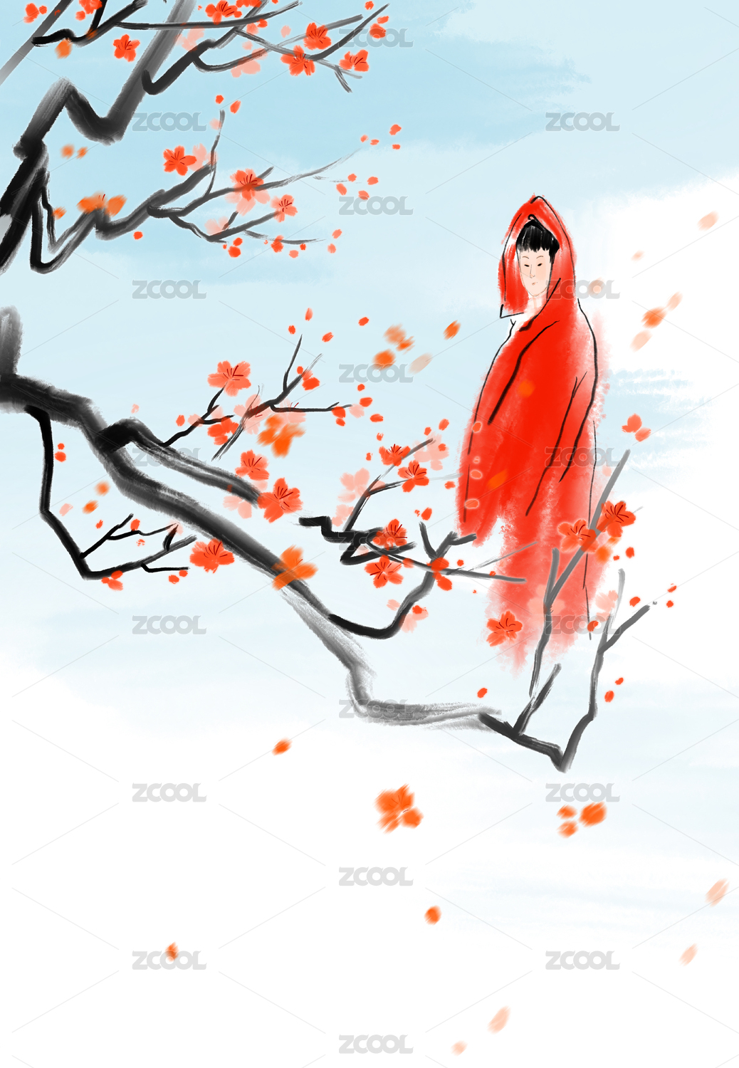 紅衣美人藍(lán)衣侍女踏雪尋梅古風(fēng)插畫