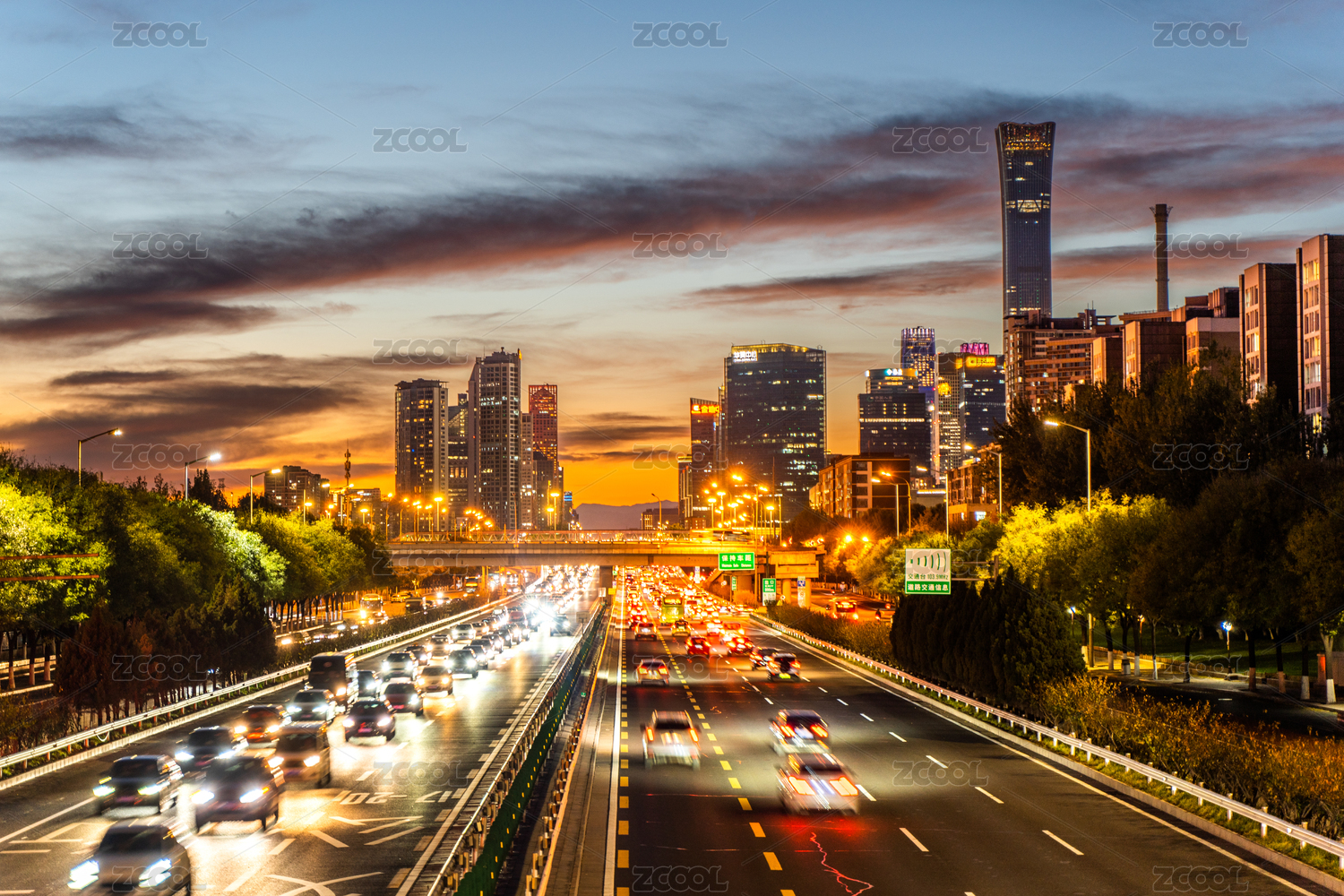 傍晚北京CBD核心區(qū)夕陽(yáng)云彩車流高峰