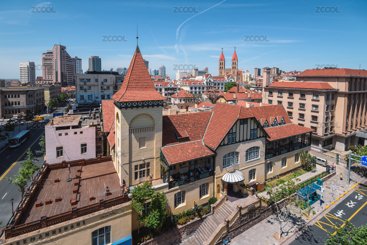中國山東省青島市老城區(qū)德式建筑群與紅瓦綠樹風景