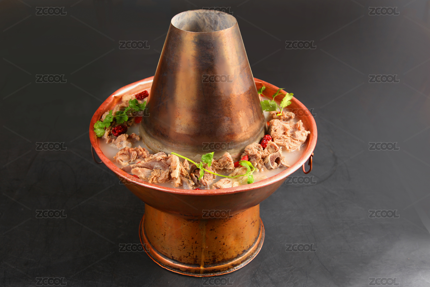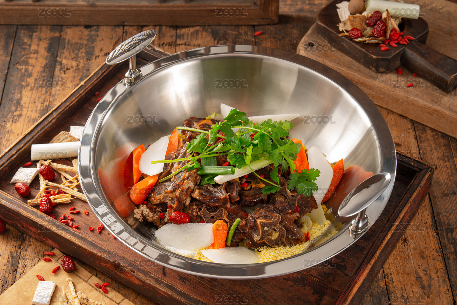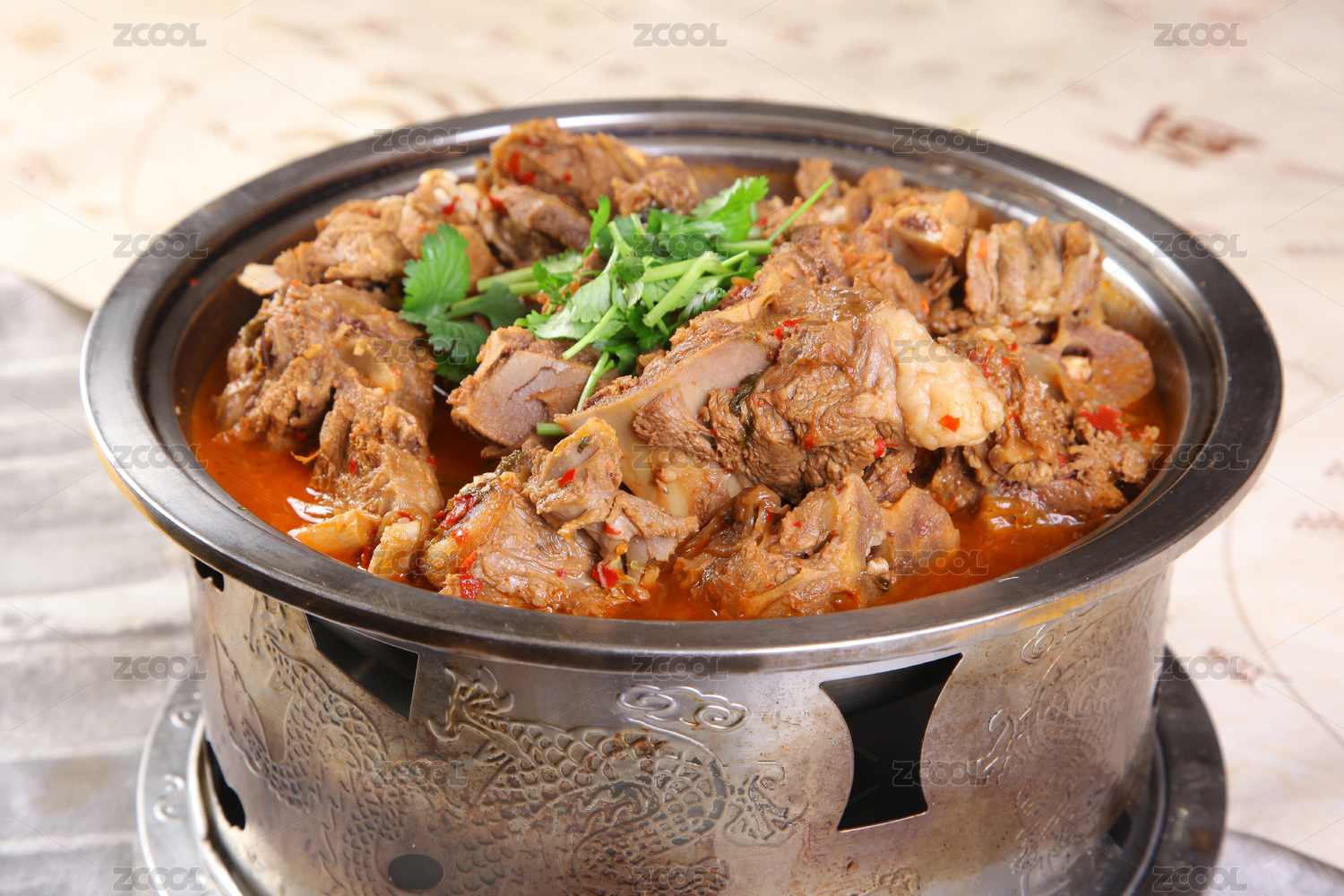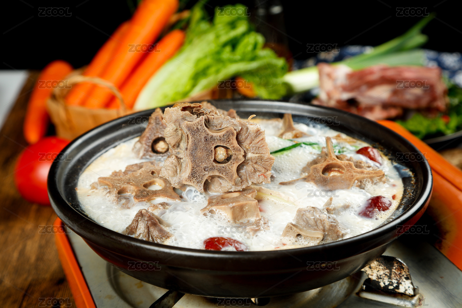 一鍋羊蝎子火鍋和筷子上夾著羊蝎子