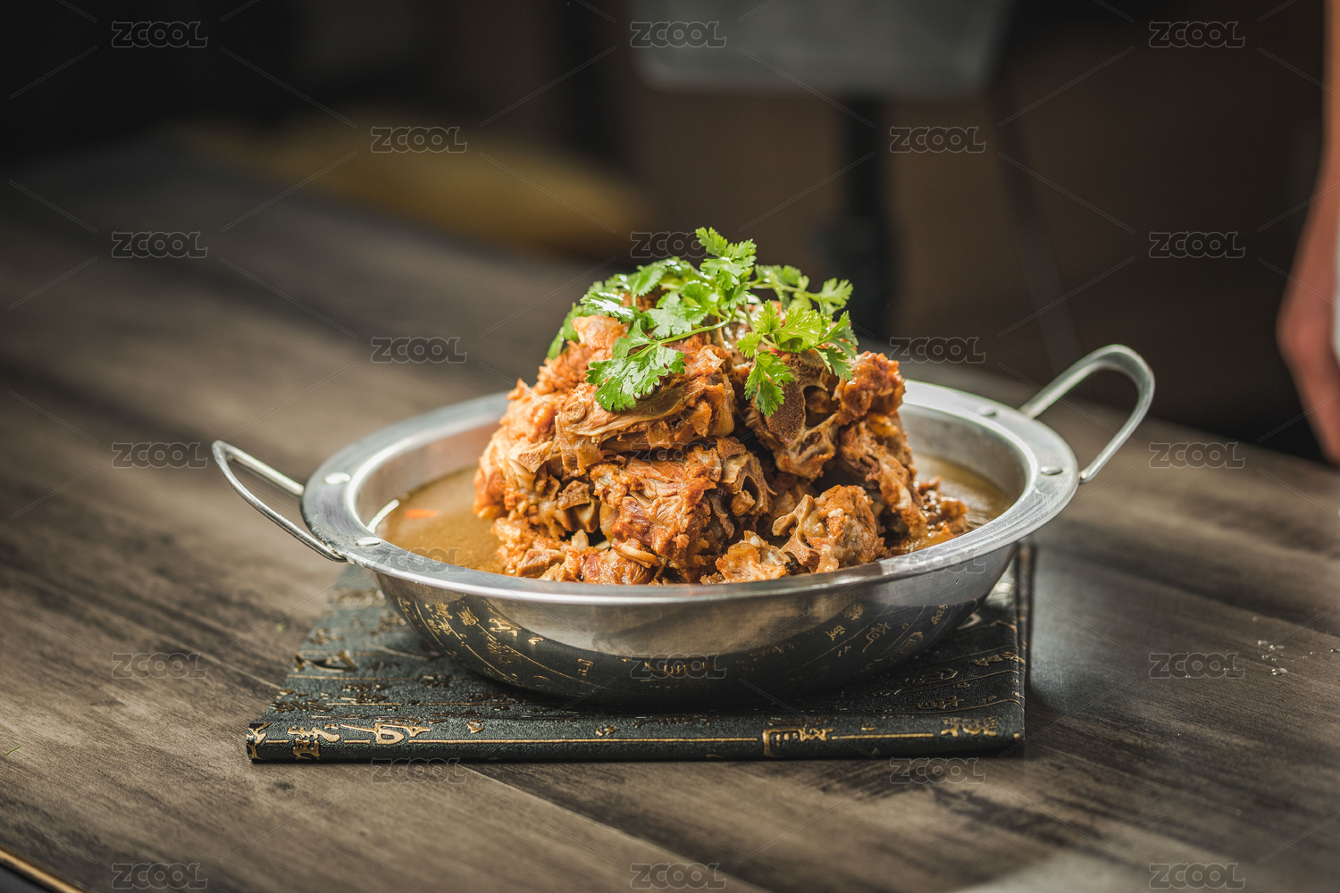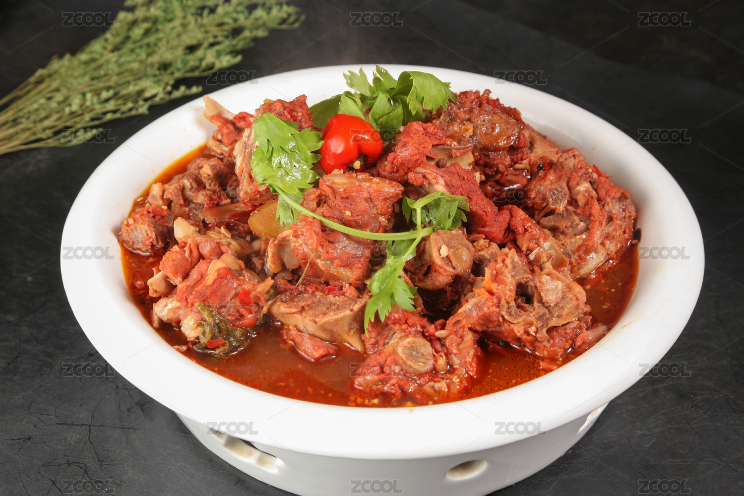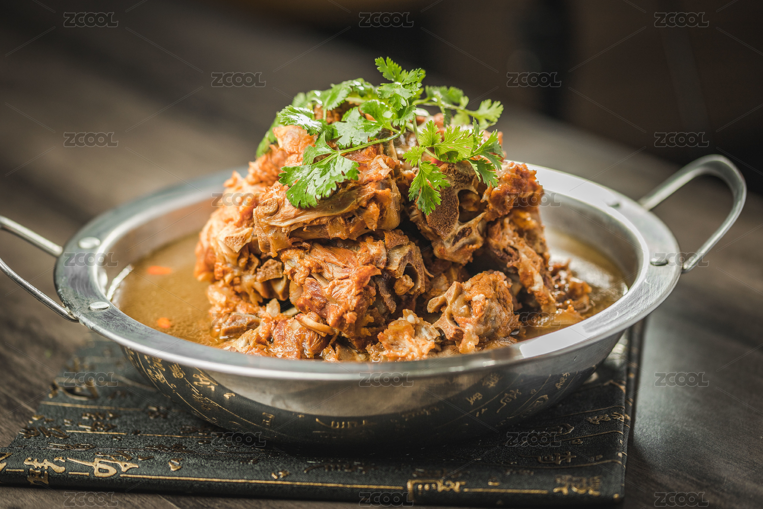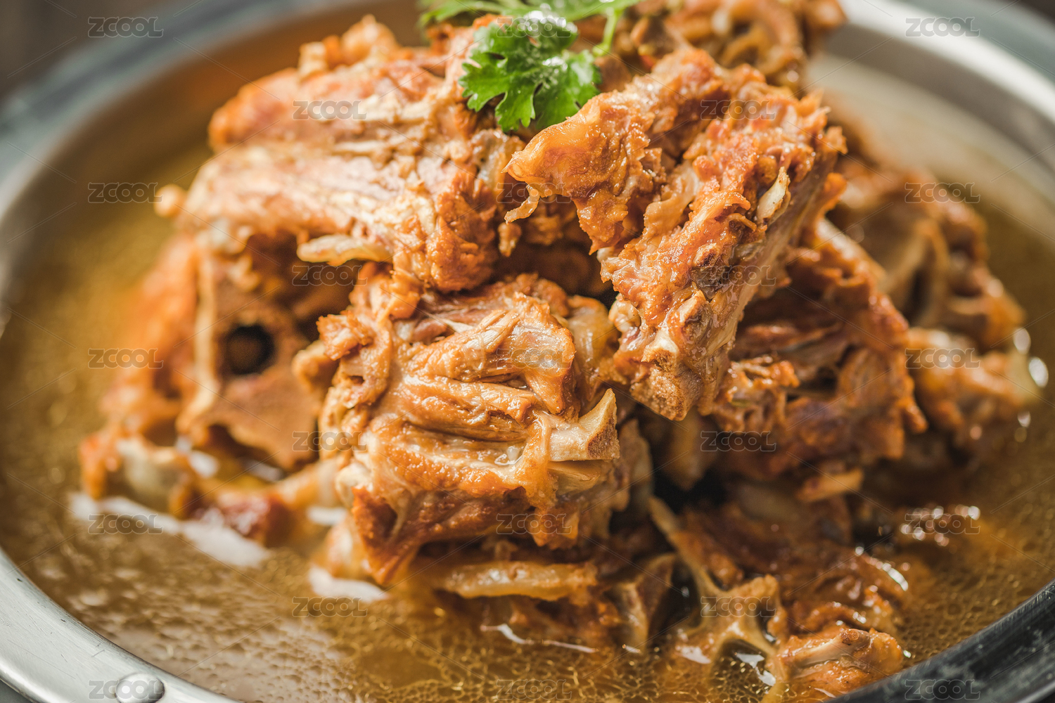 一鍋羊蝎子火鍋和筷子上夾著羊蝎子