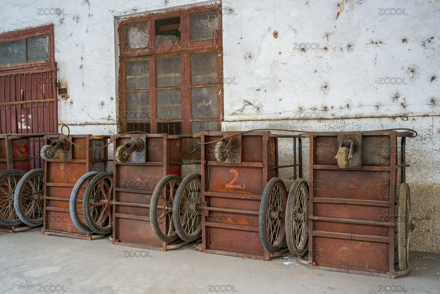 工廠里擺放的一排拉貨拉板車