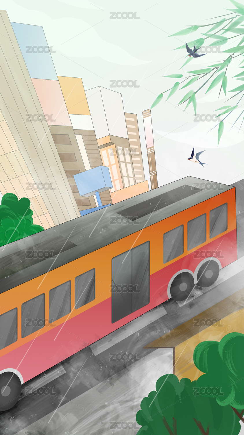 城市下雨天公交車站插畫