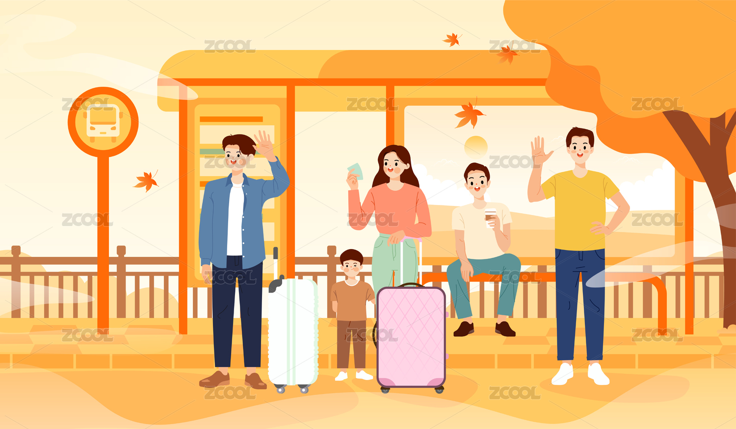 在公交車站等車的人矢量插畫