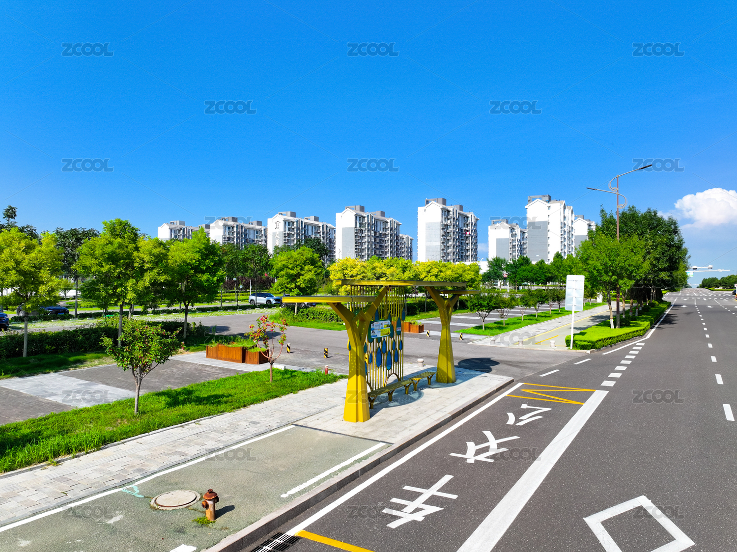 干凈的道路,公交車站和現(xiàn)代建筑背景