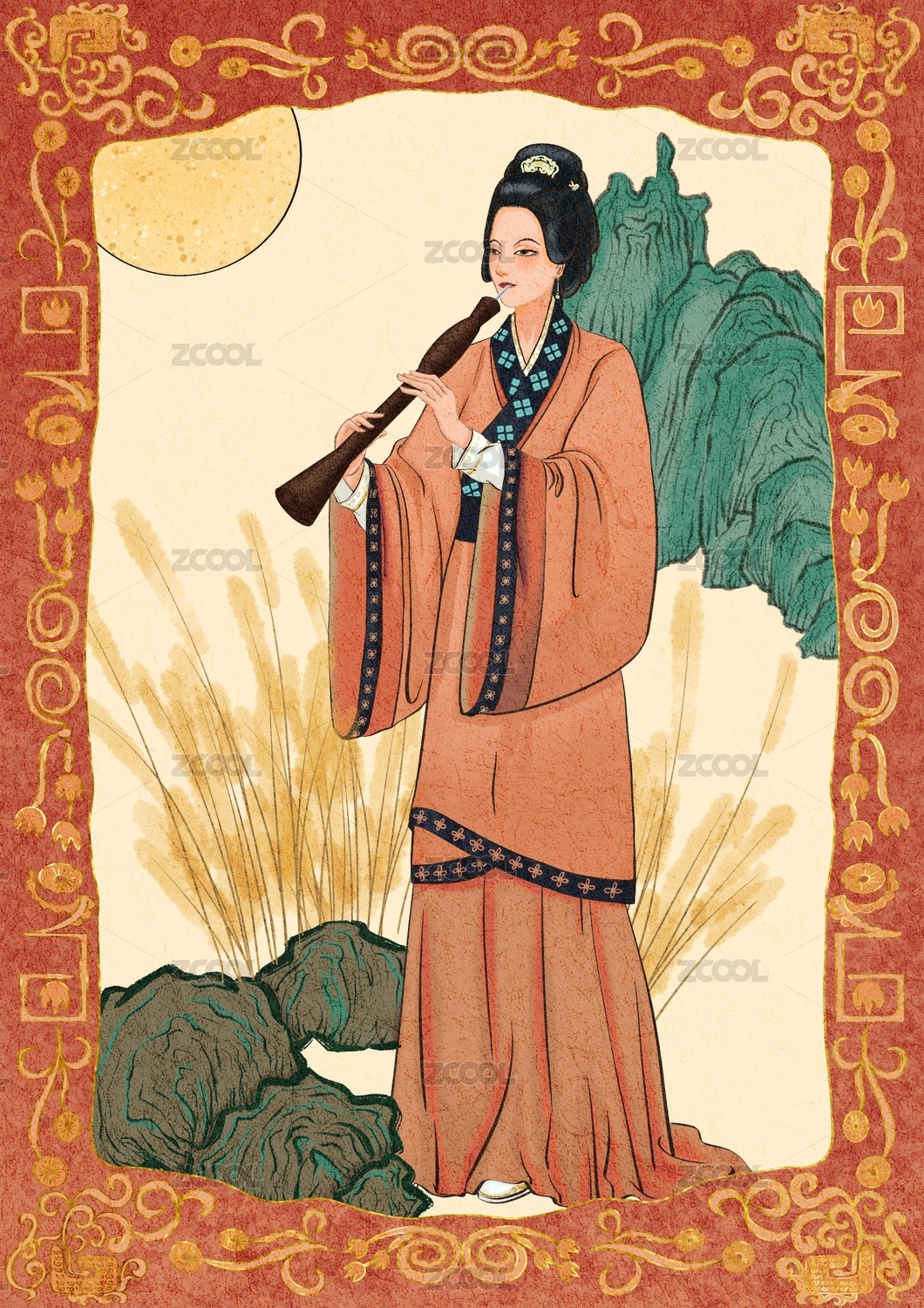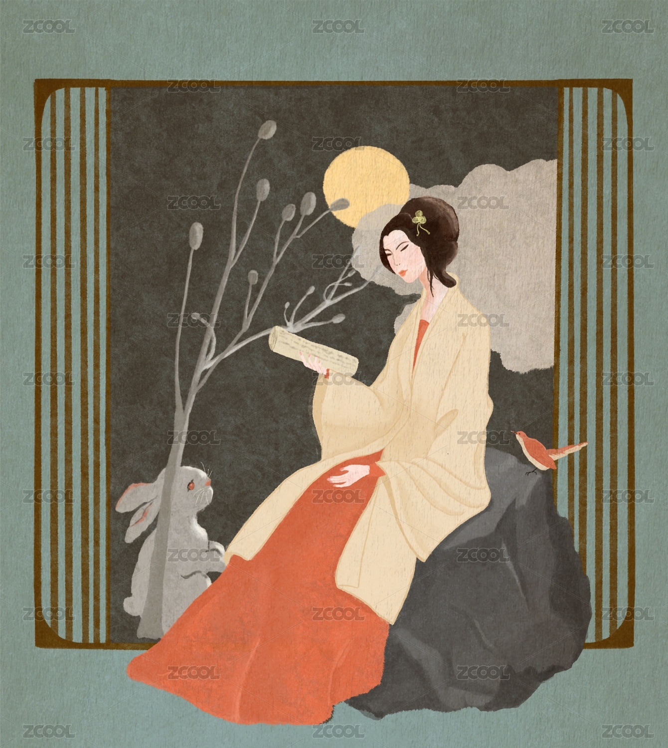 古代才女坐在畫有圓月兔子的屏風(fēng)前看書