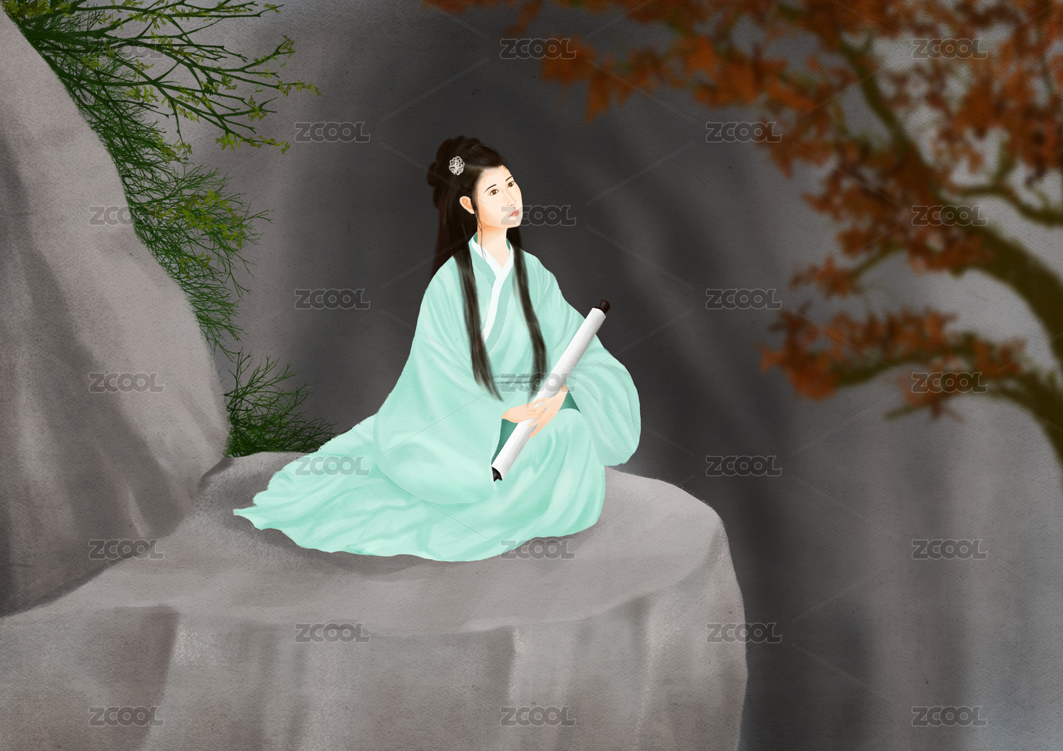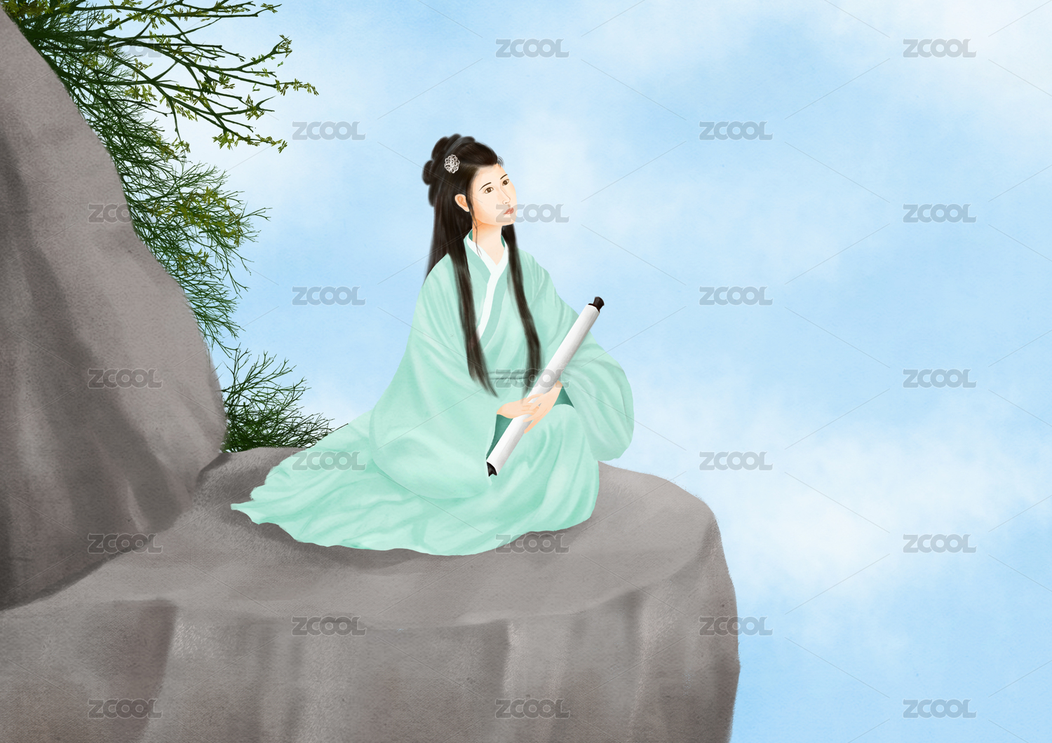 坐在山崖邊拿畫卷的綠衣古代女子
