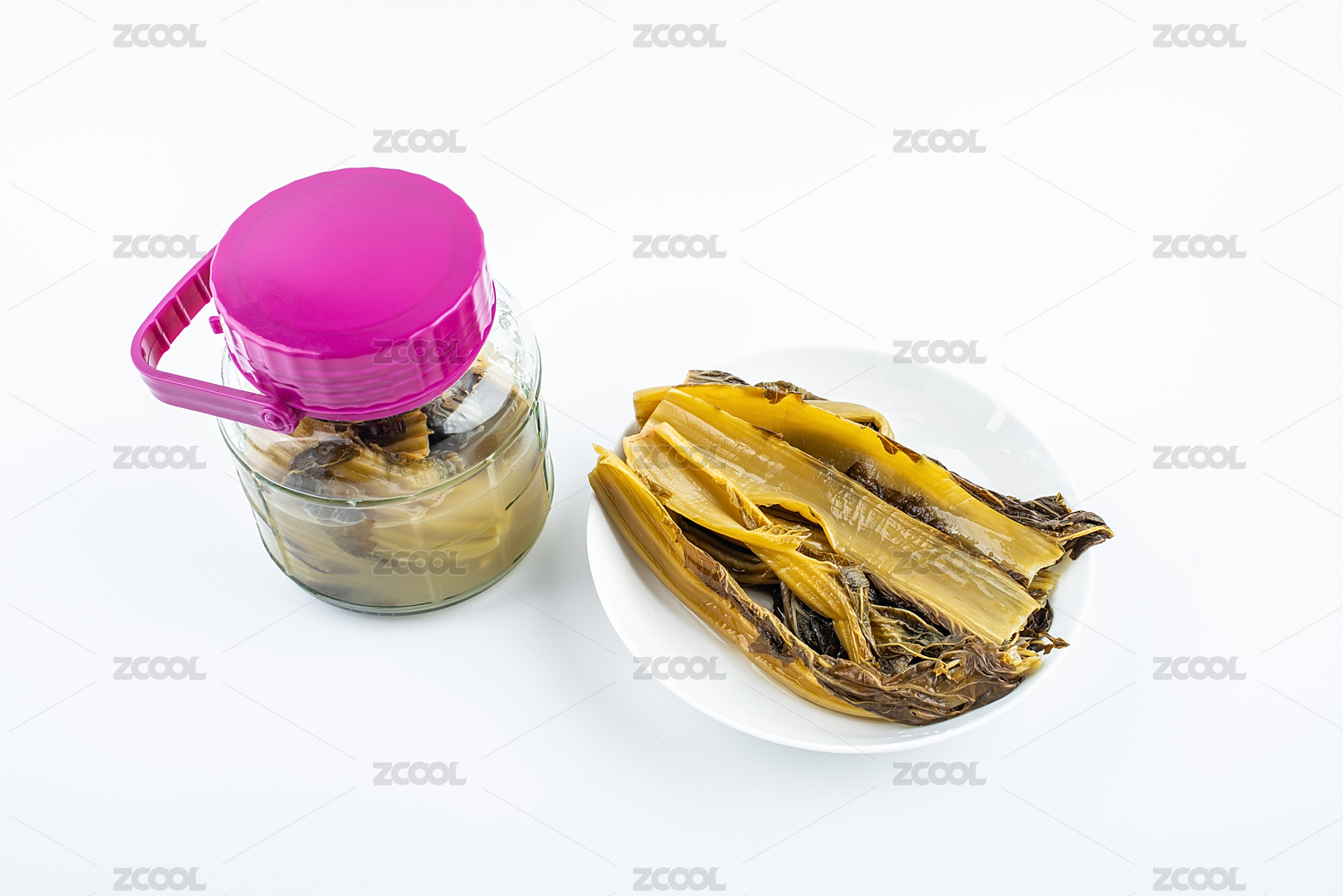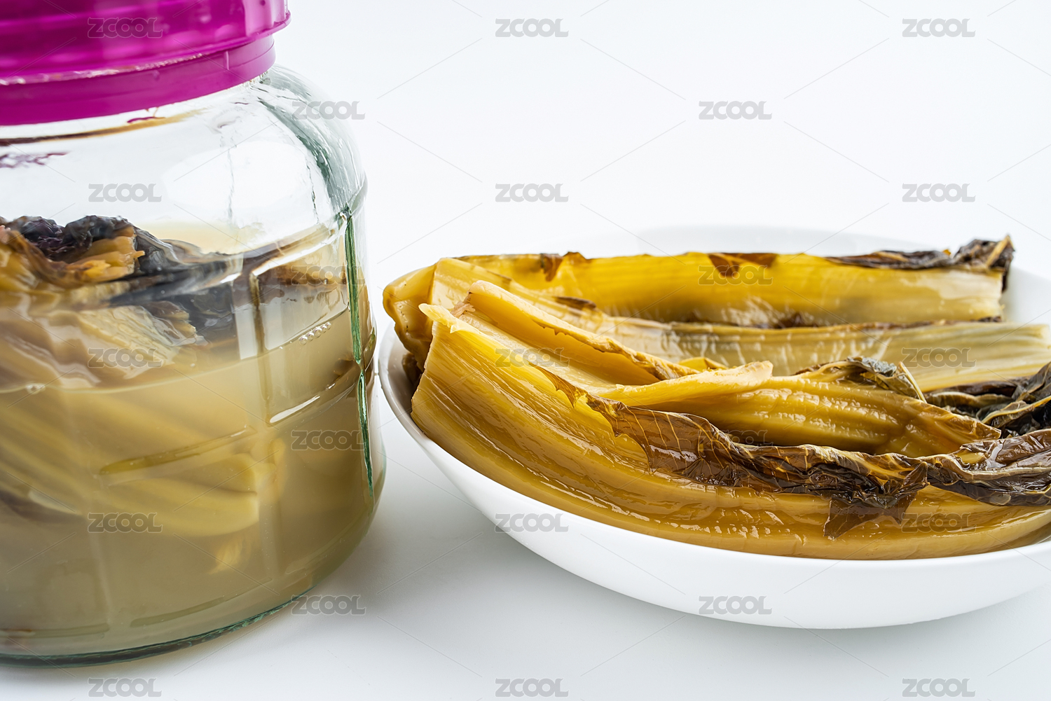 白背景上一碟腌制成金黃色酸芥菜