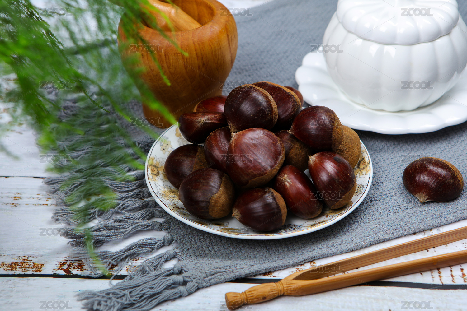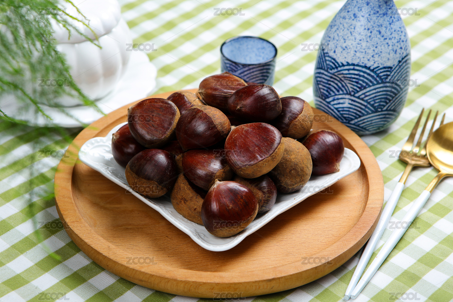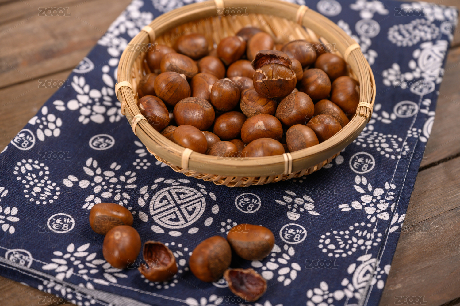 一盤糖炒栗子擺放在古窗欞背景木桌面上
