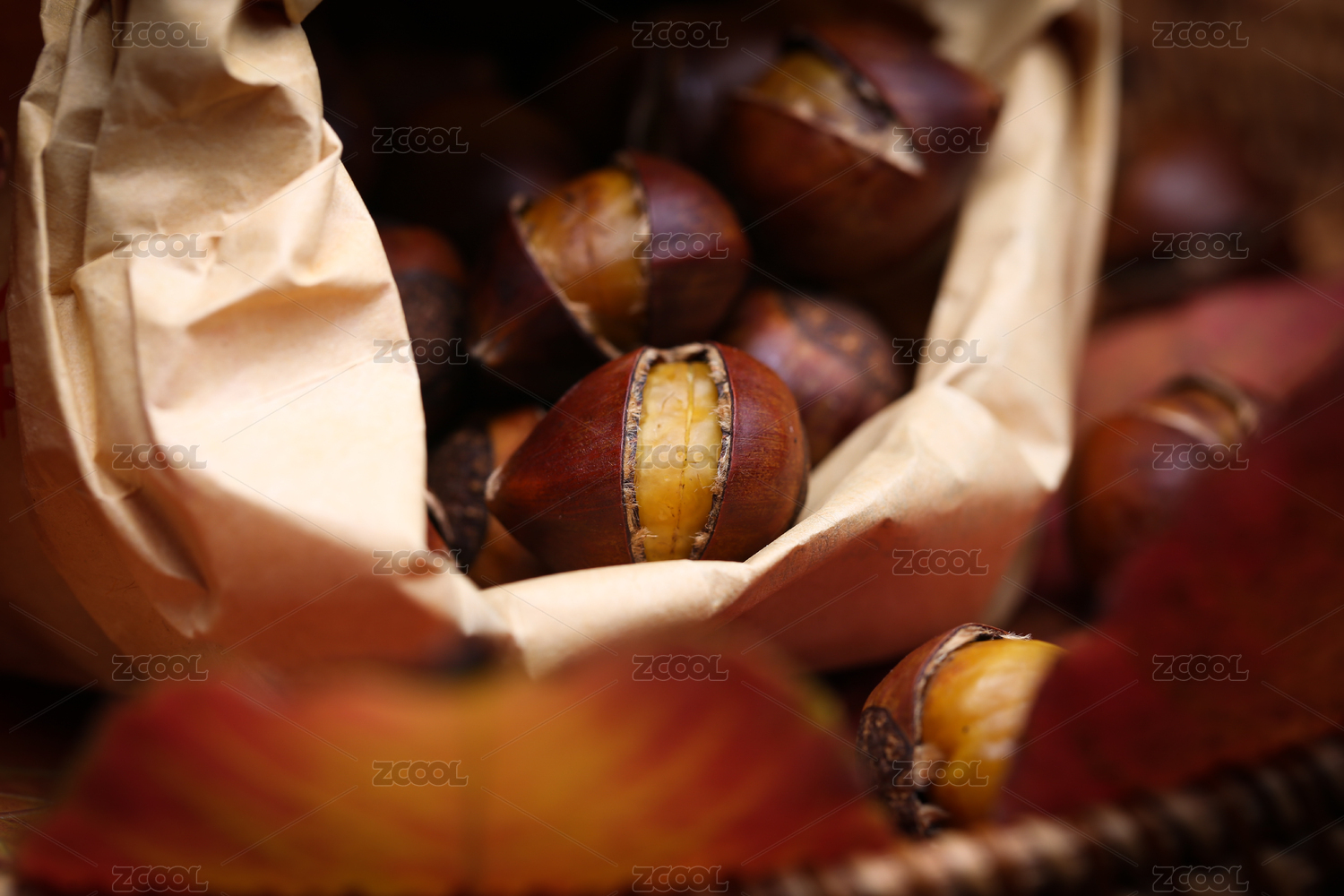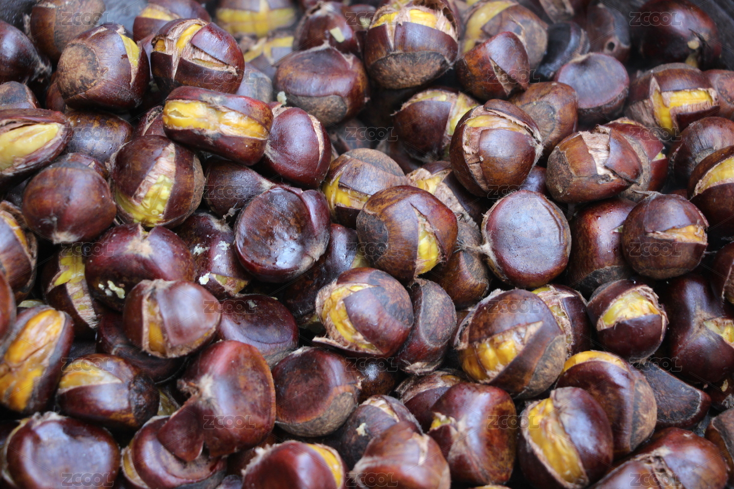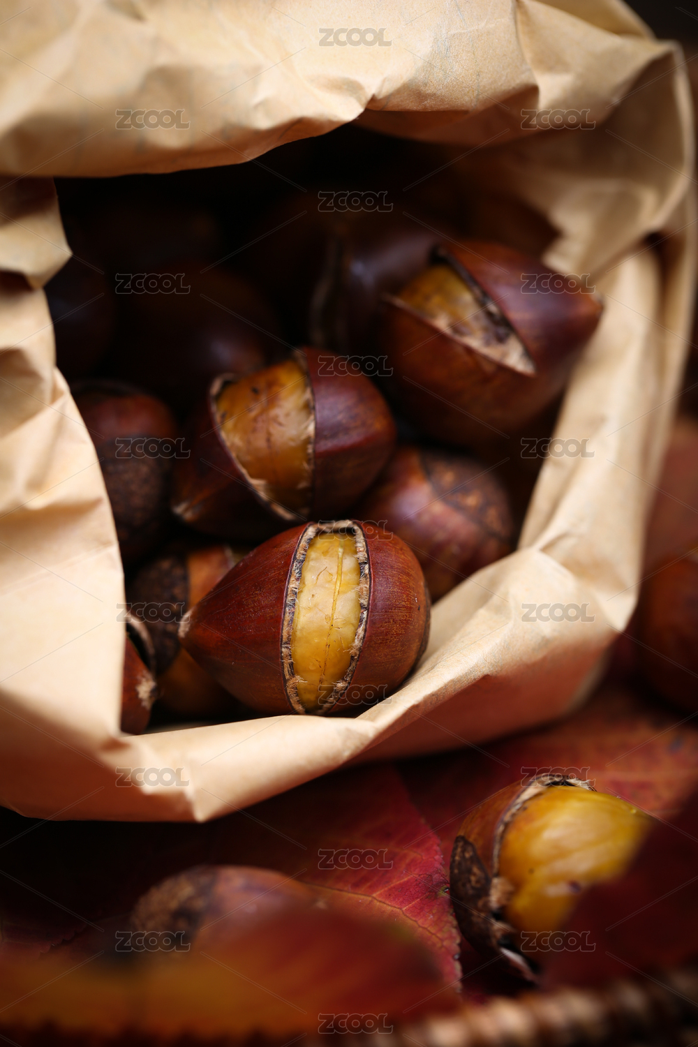 一盤糖炒栗子擺放在古窗欞背景木桌面上