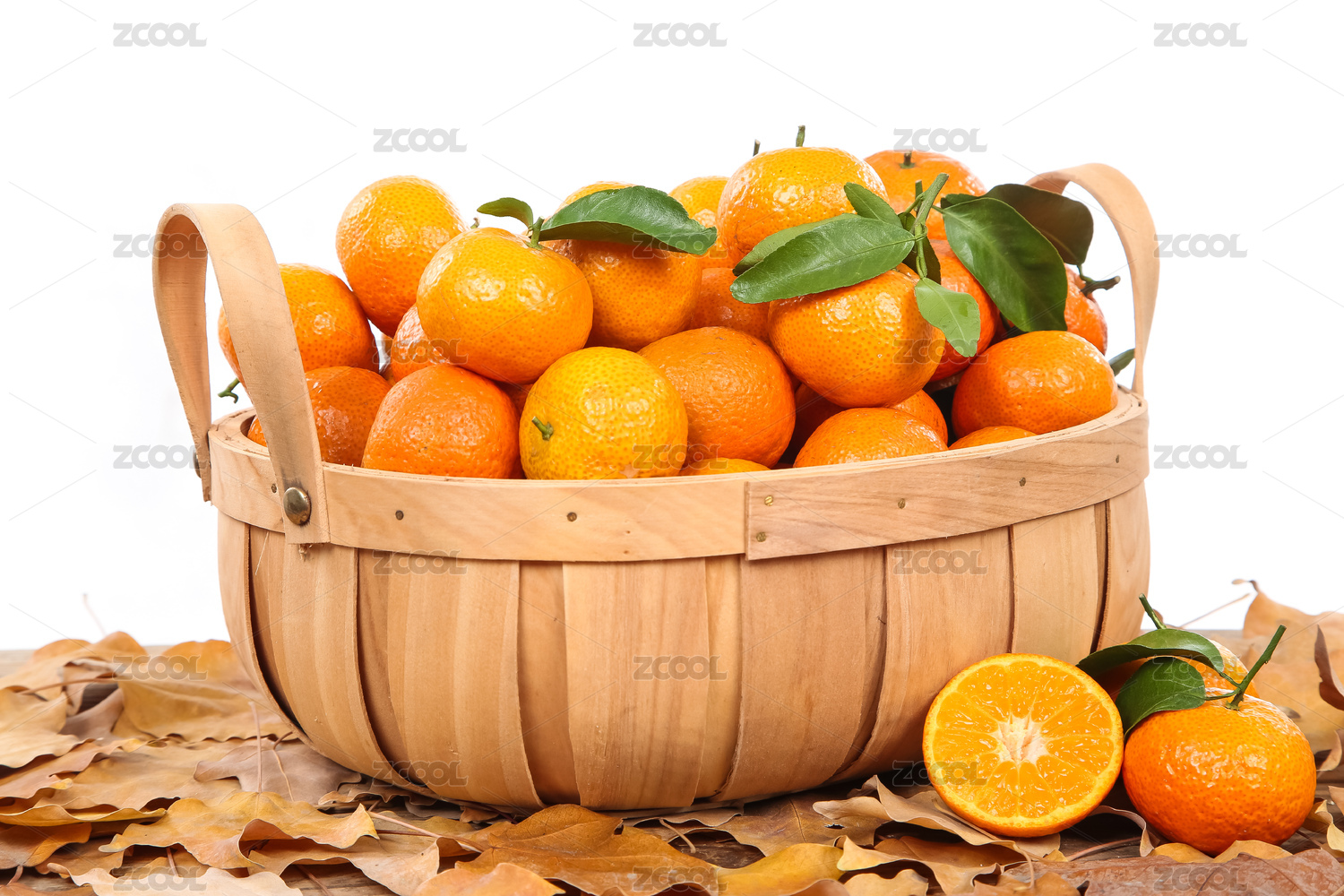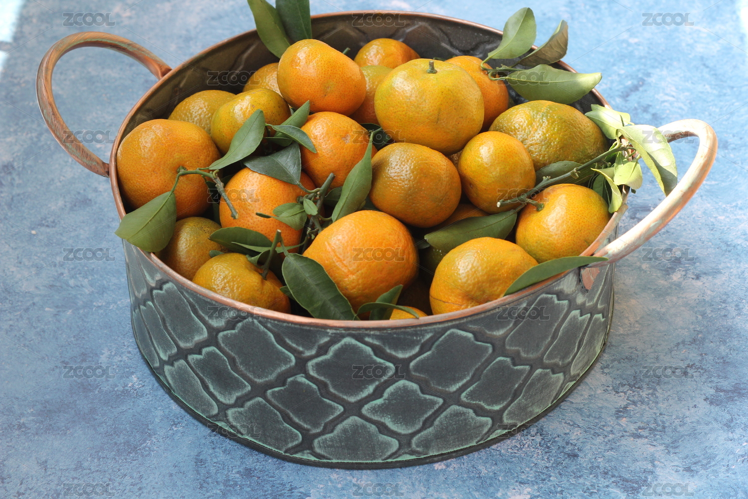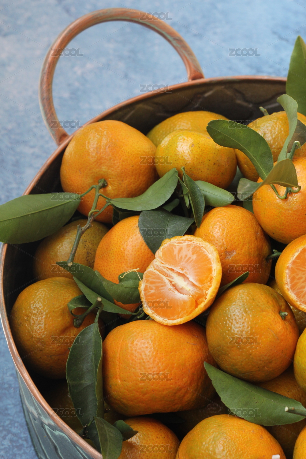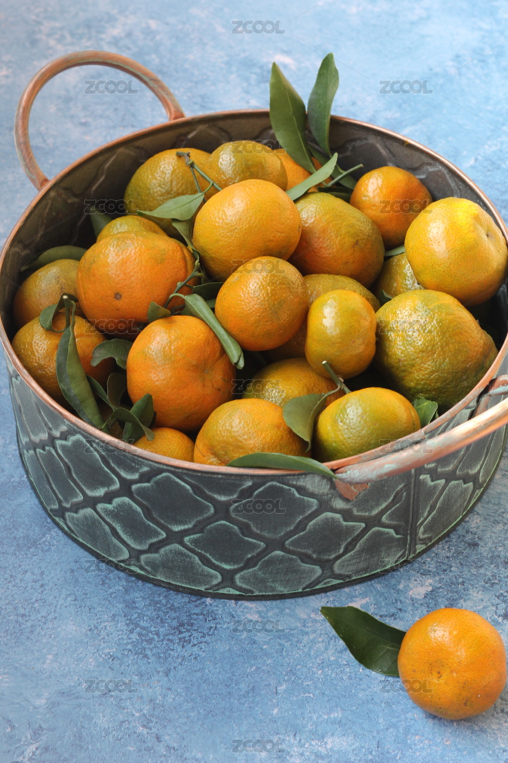 地上樹葉上放著一藍(lán)新鮮的小橘子