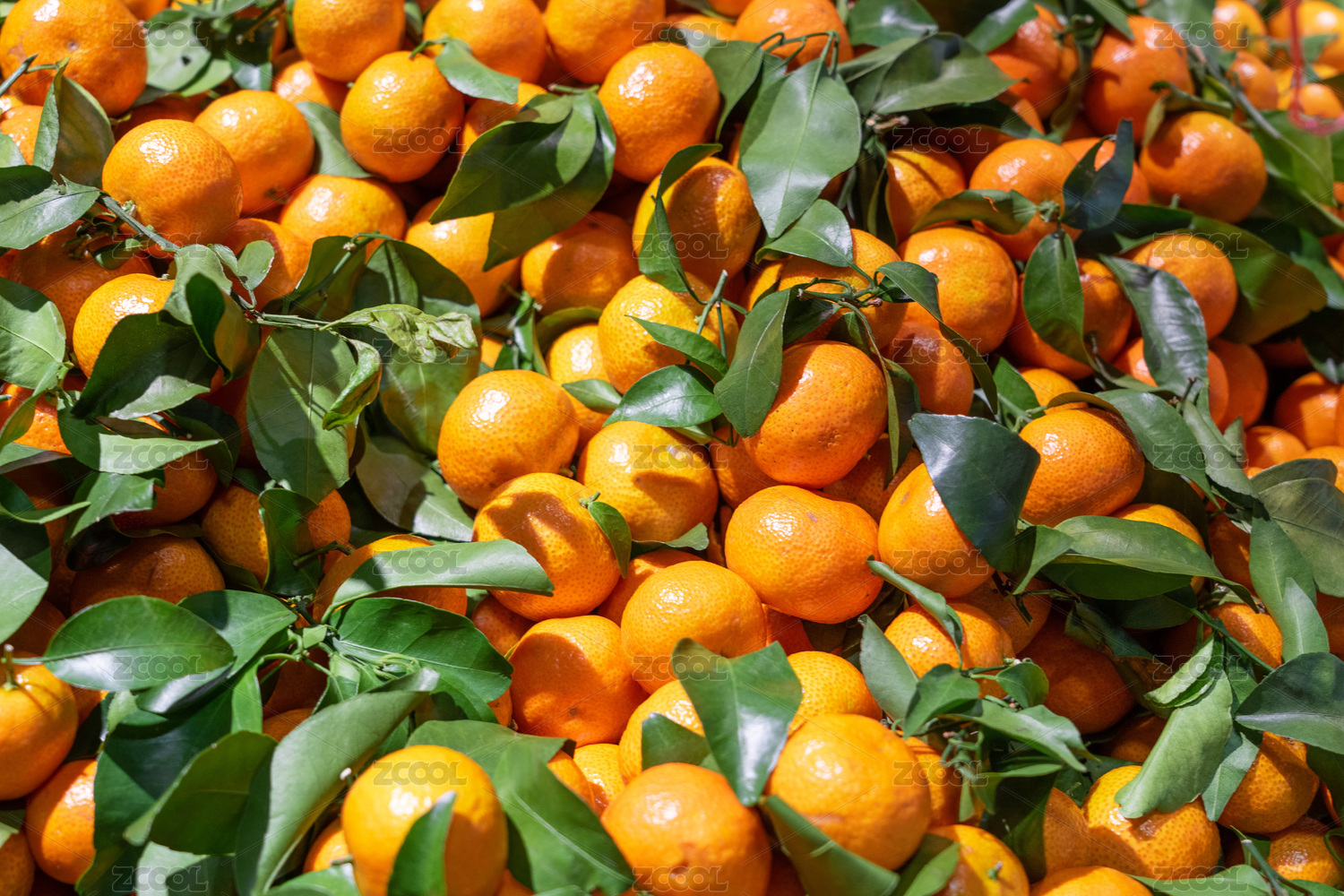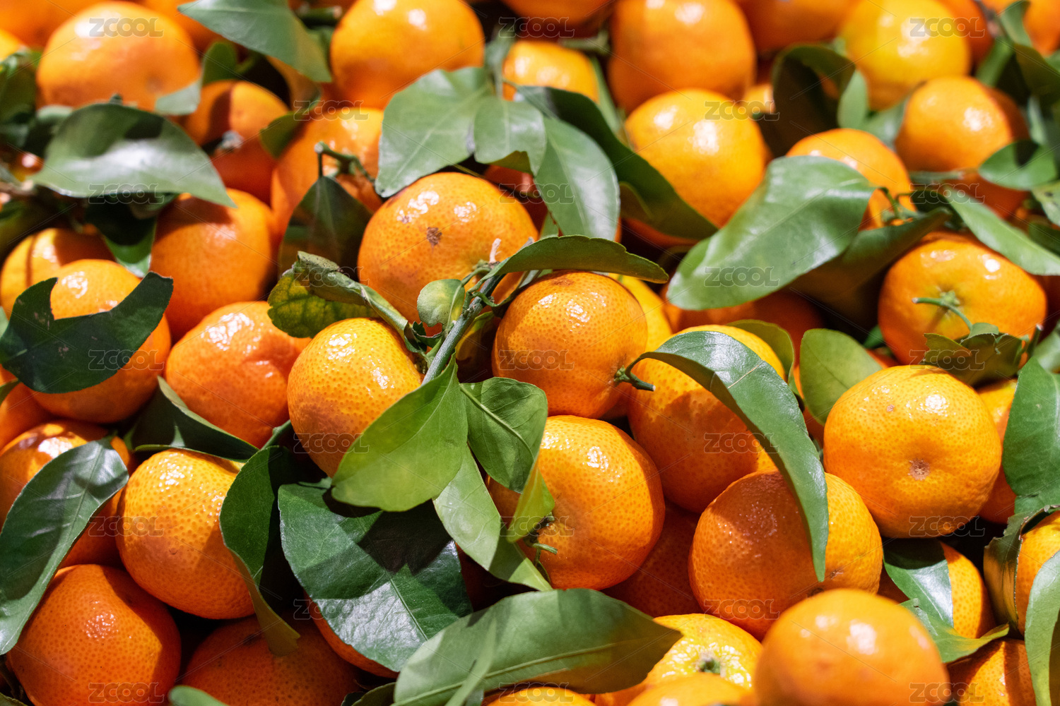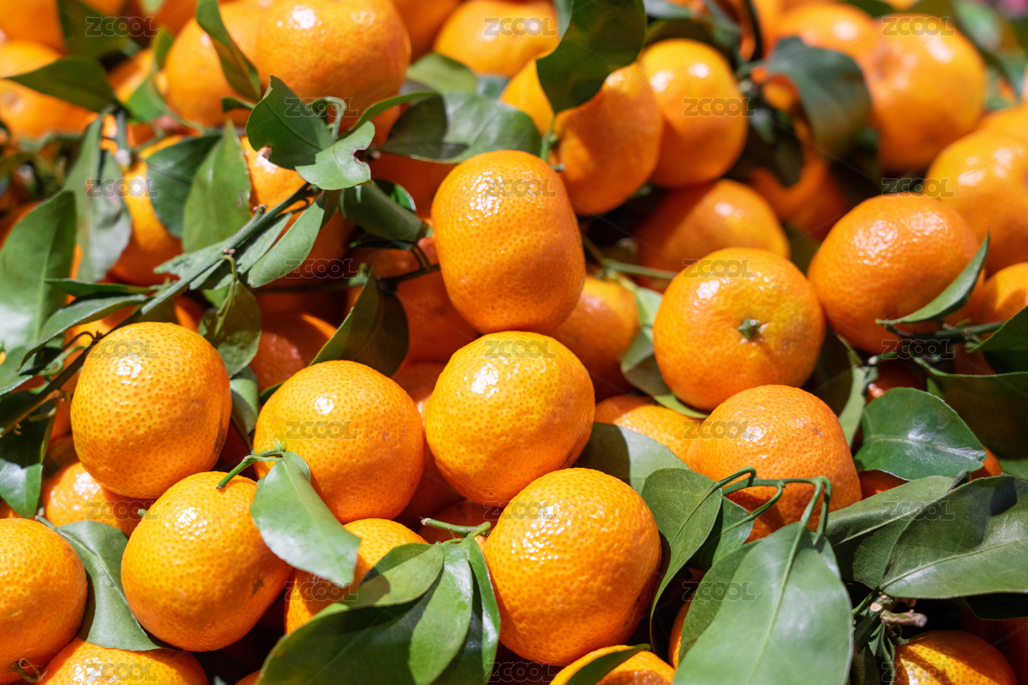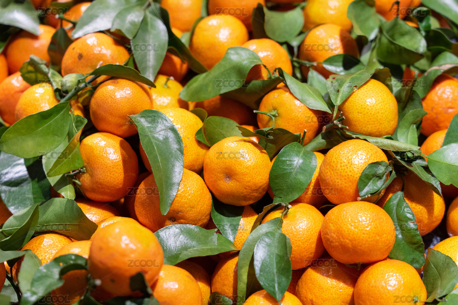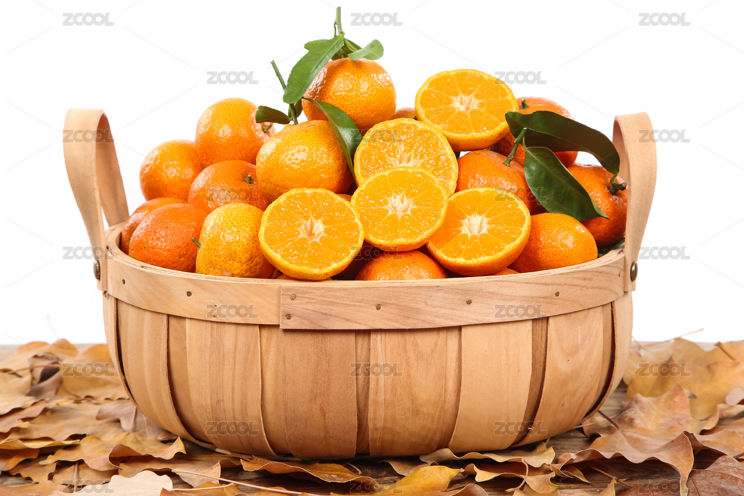 地上樹葉上放著一藍(lán)新鮮的小橘子
