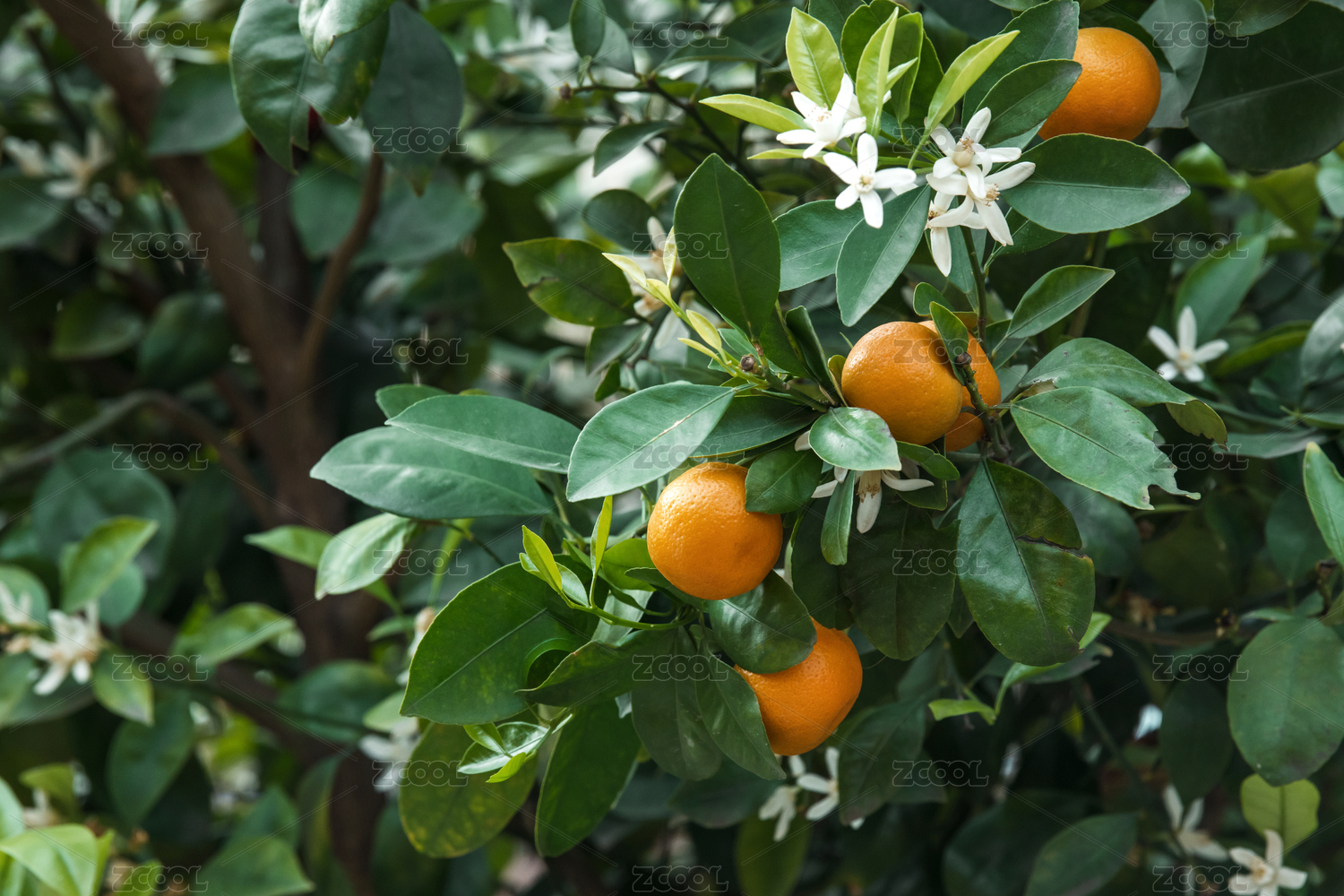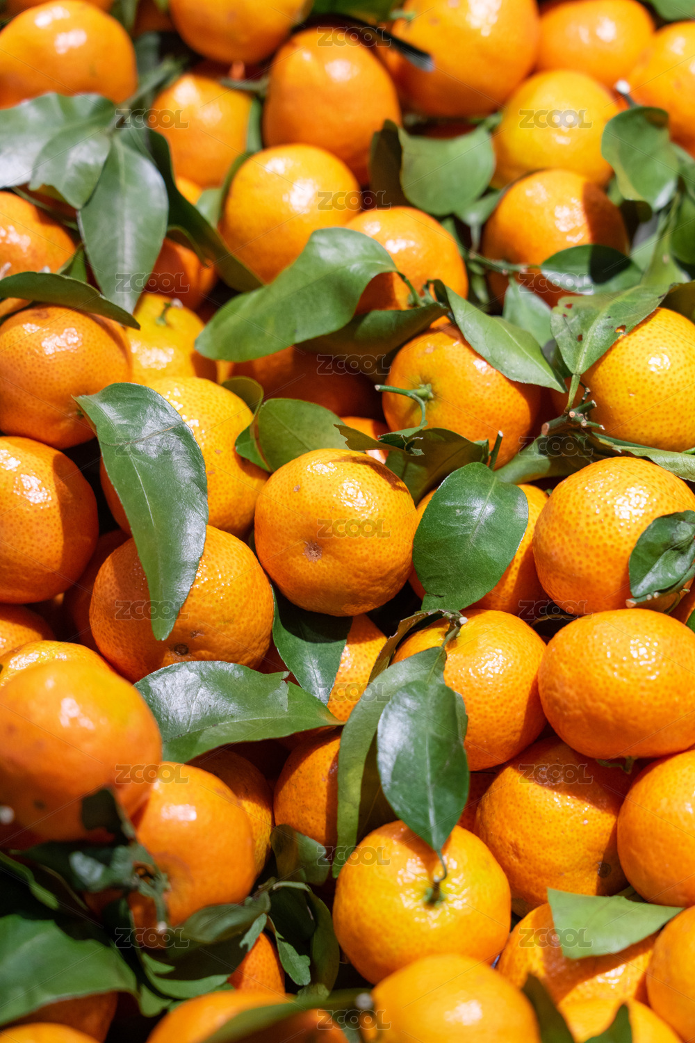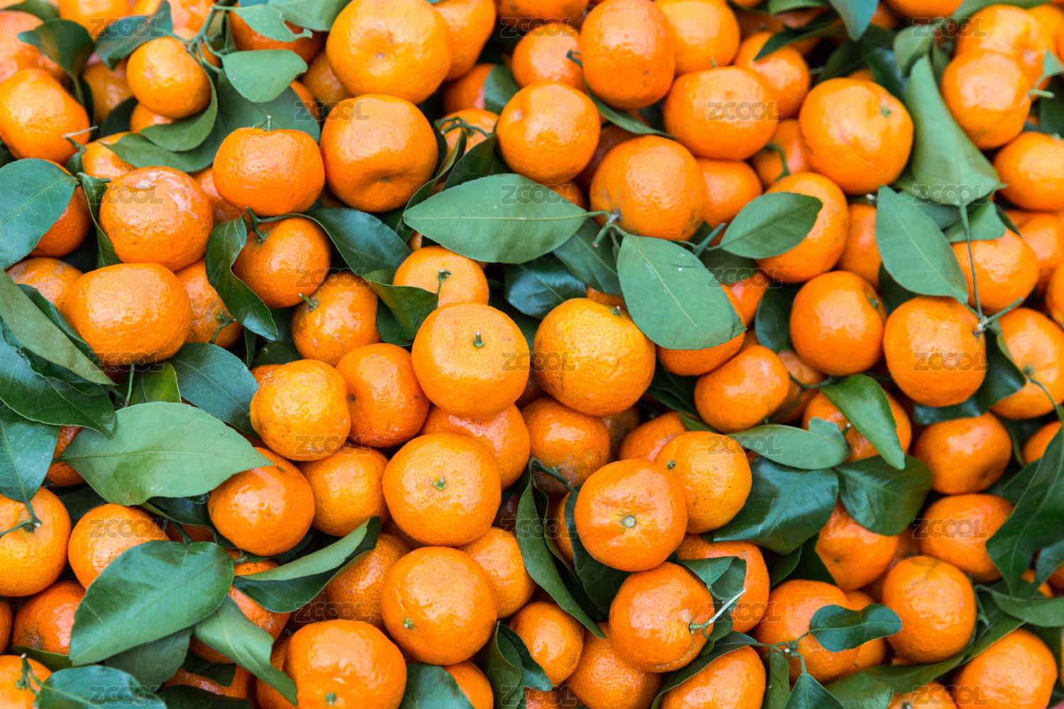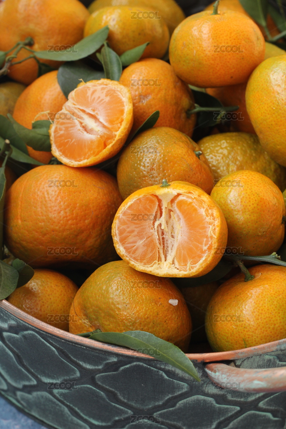 地上樹葉上放著一藍(lán)新鮮的小橘子