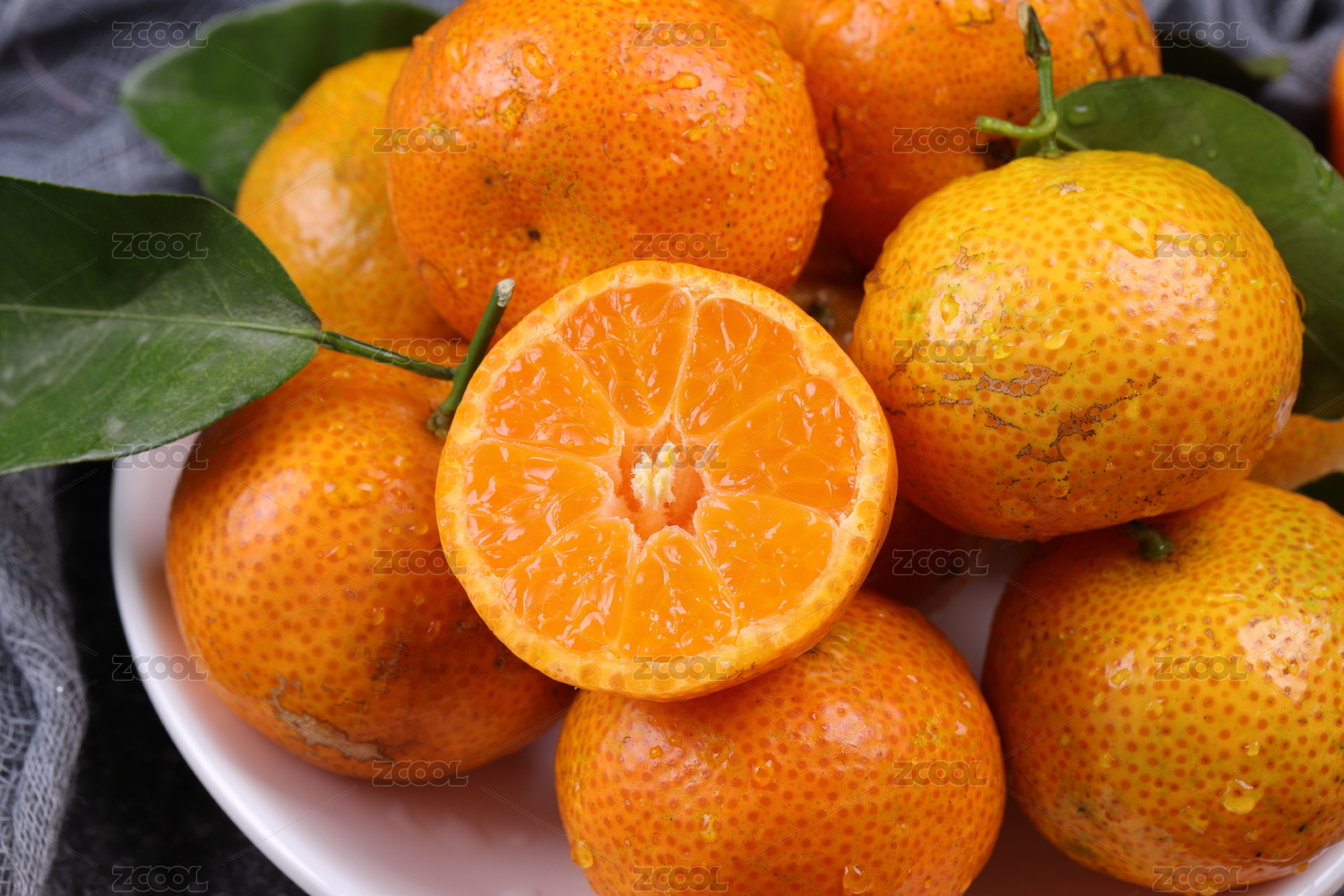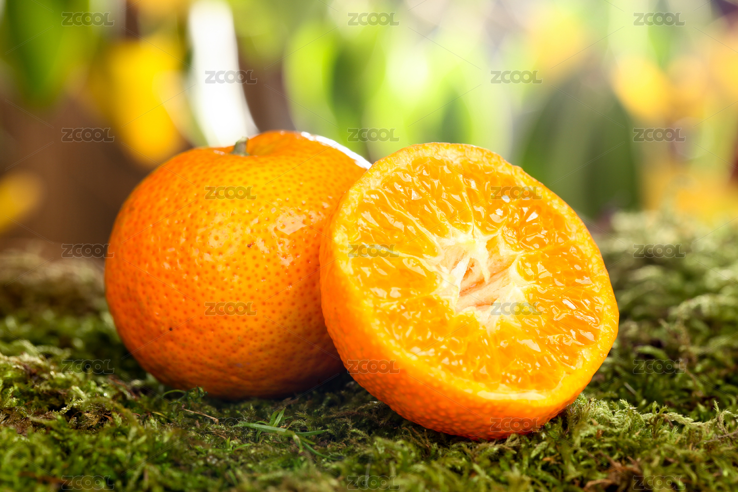 草地上放著一個(gè)完整的砂糖桔和半邊小橘子