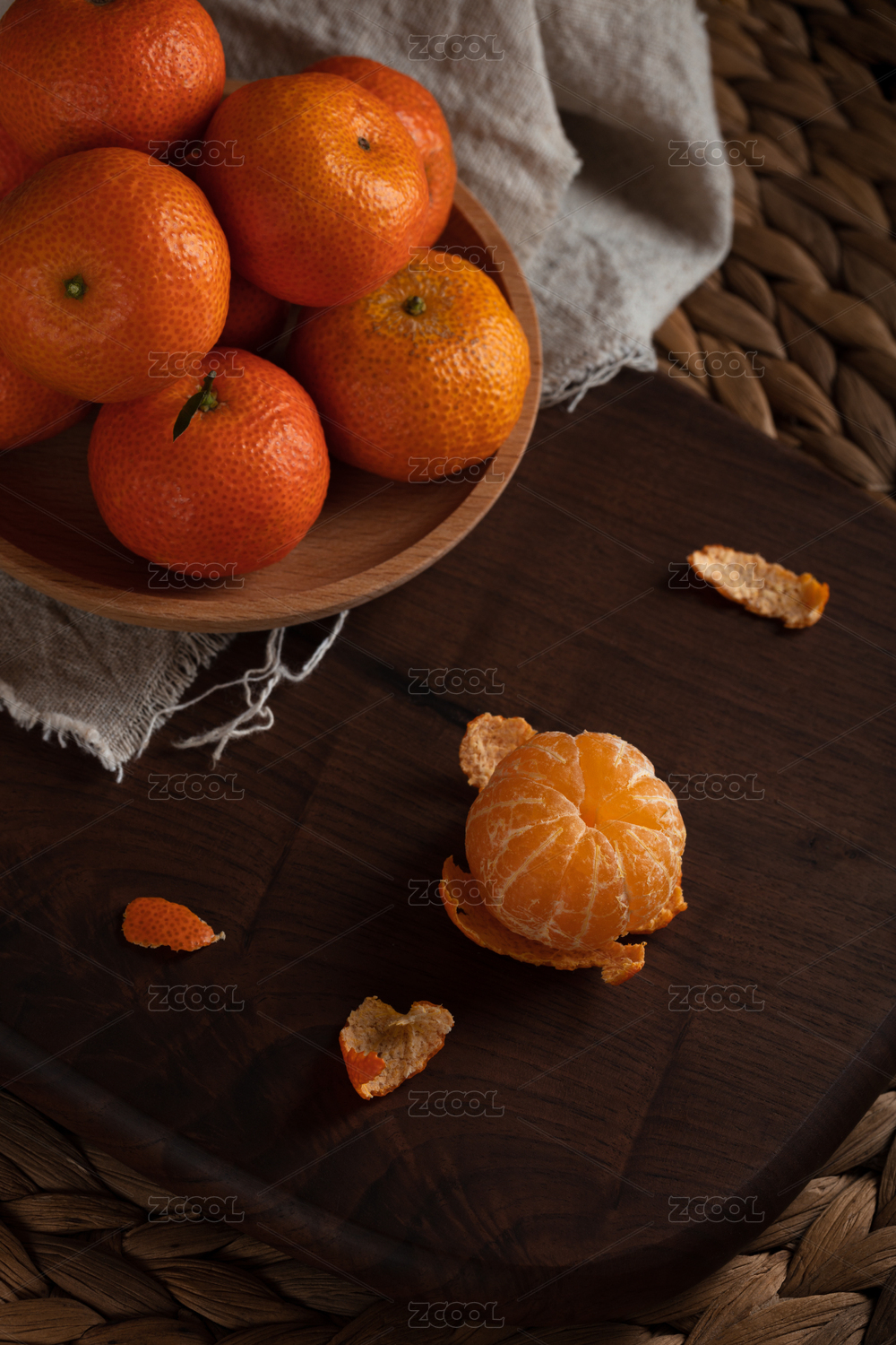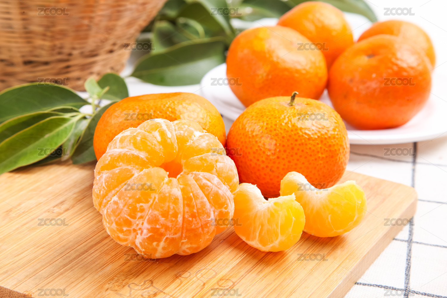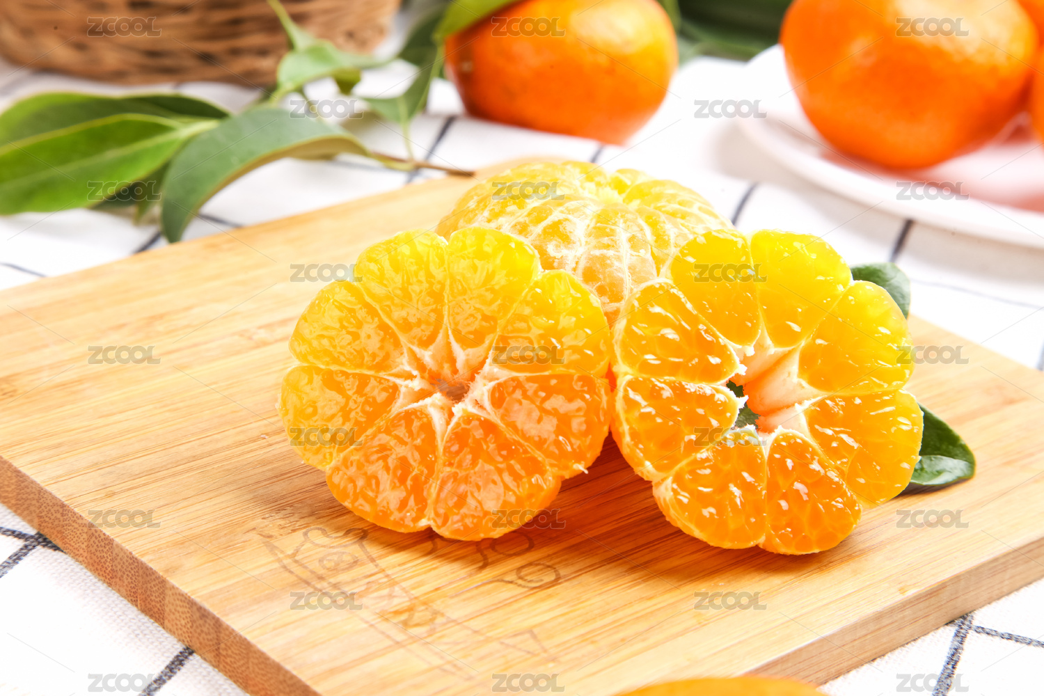 木板上放著一堆冰糖橘和剝皮的小橘子