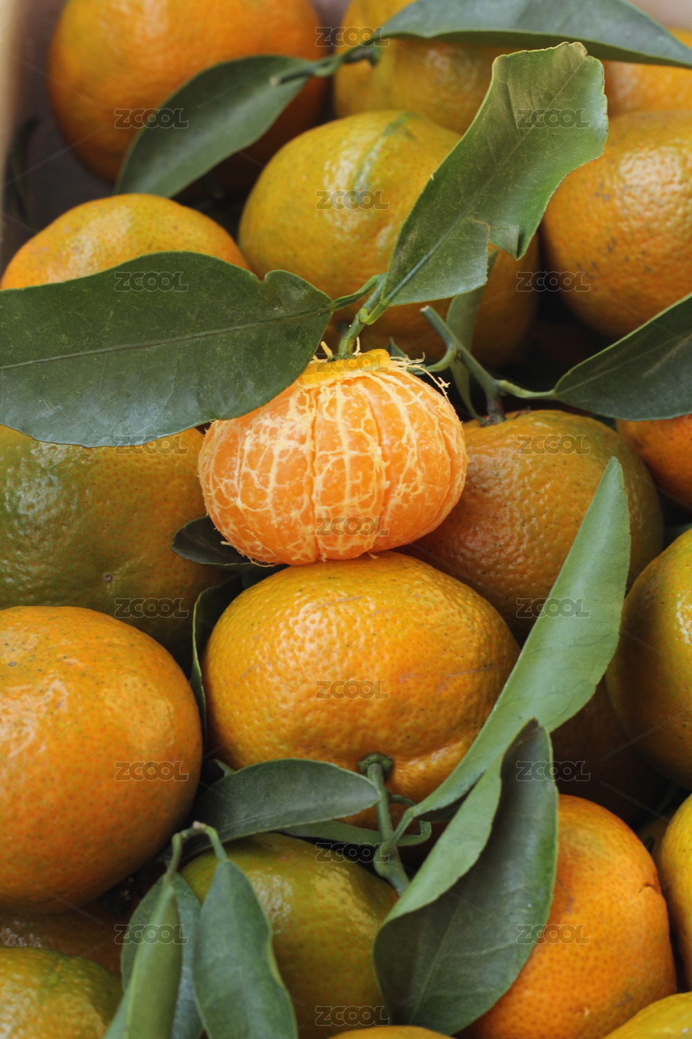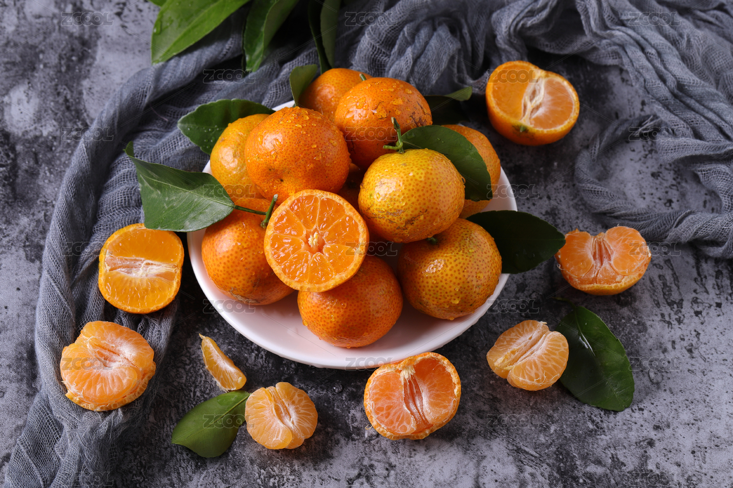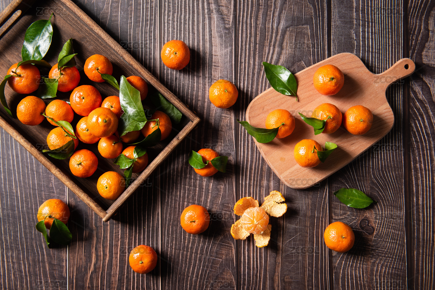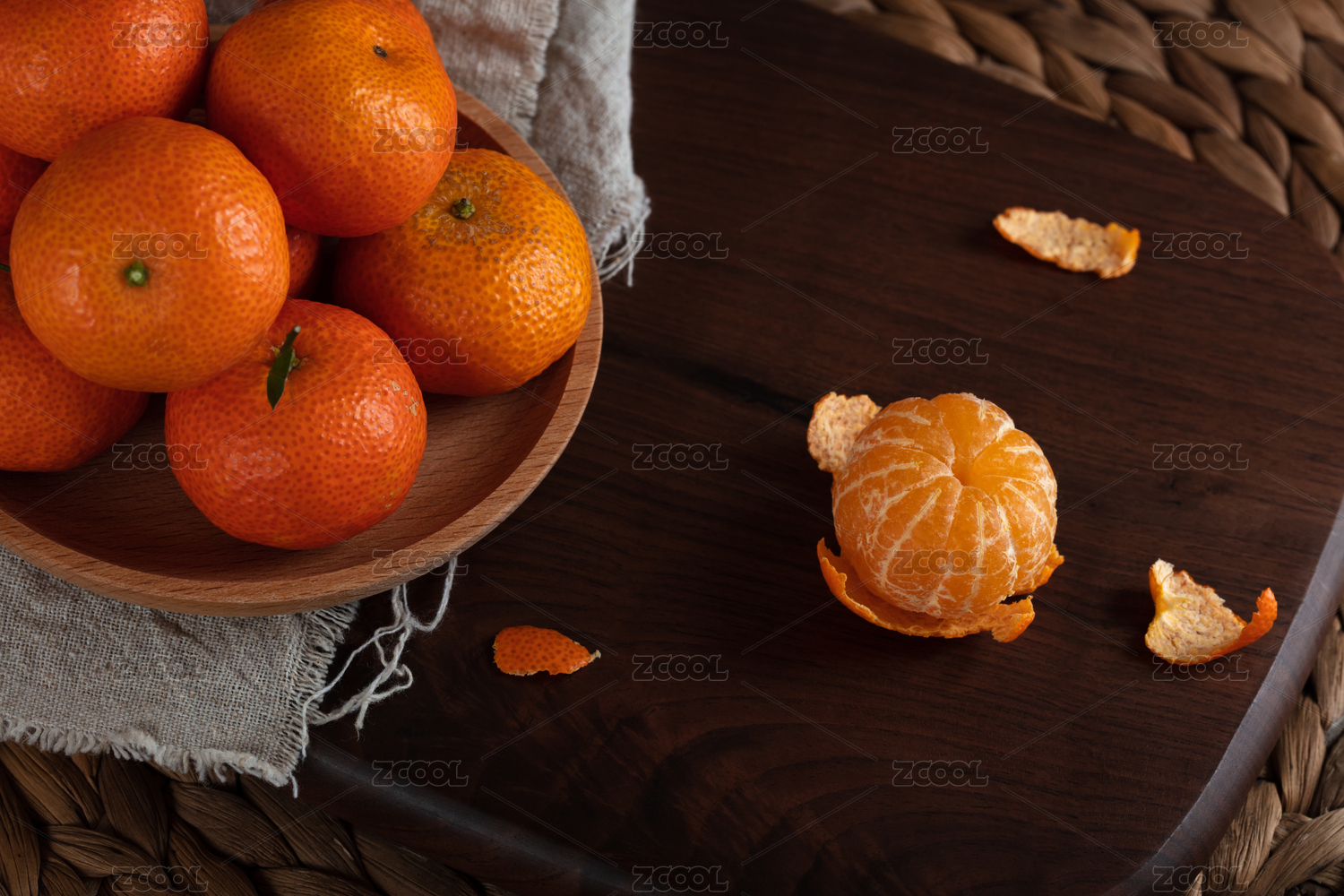 木板上放著一堆冰糖橘和剝皮的小橘子