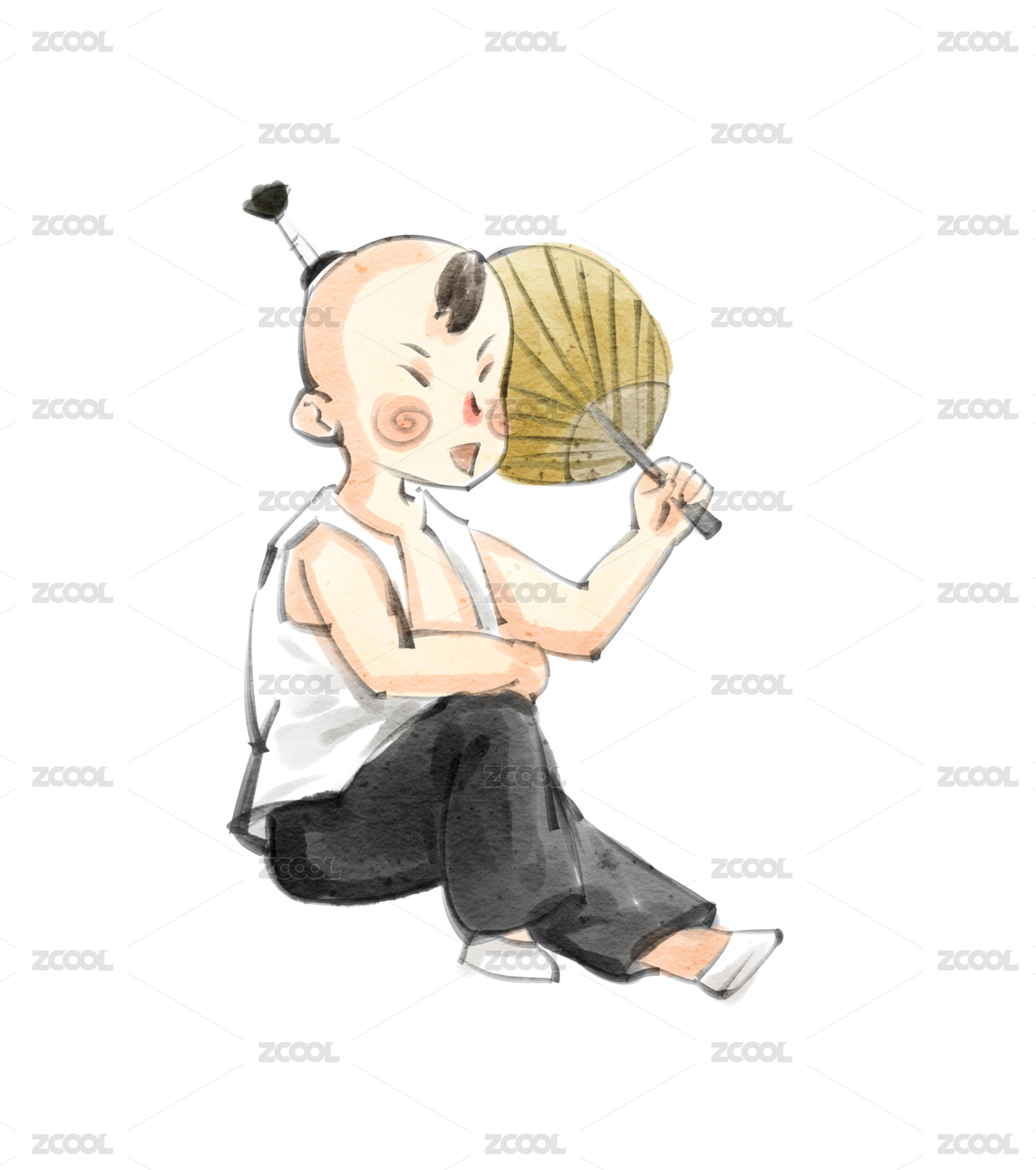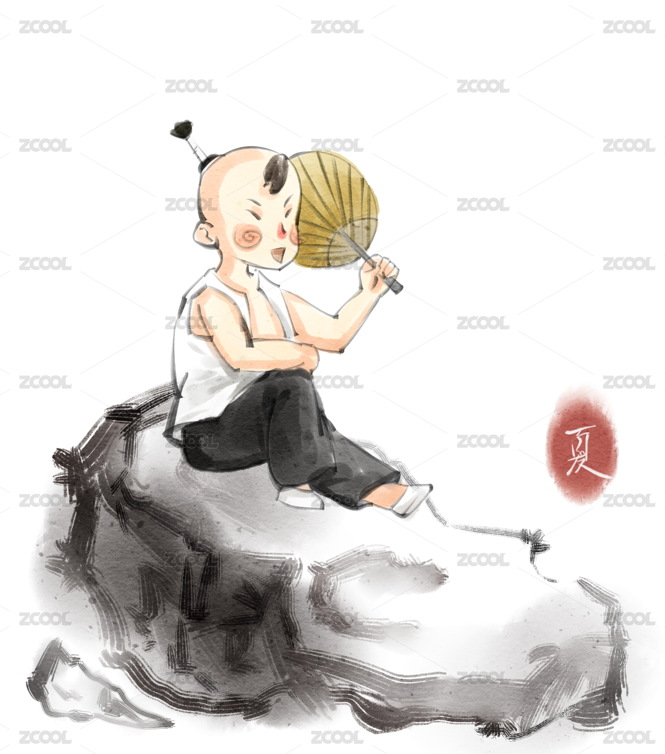 中國(guó)水墨風(fēng)格夏天男童乘涼插畫人物元素