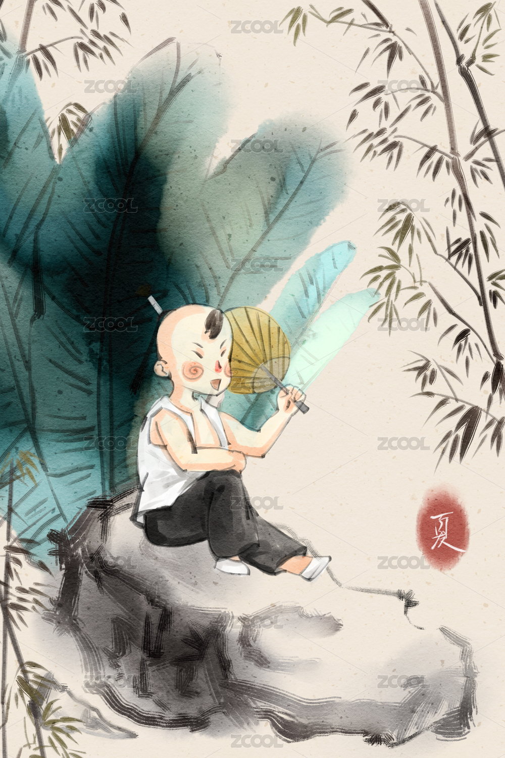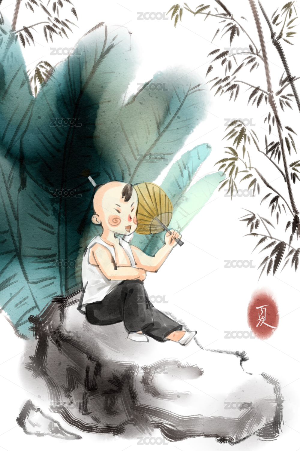 中國(guó)水墨風(fēng)格夏天男孩芭蕉樹下休息插畫