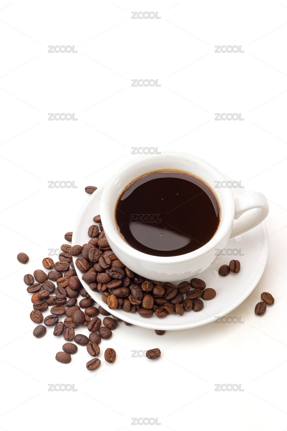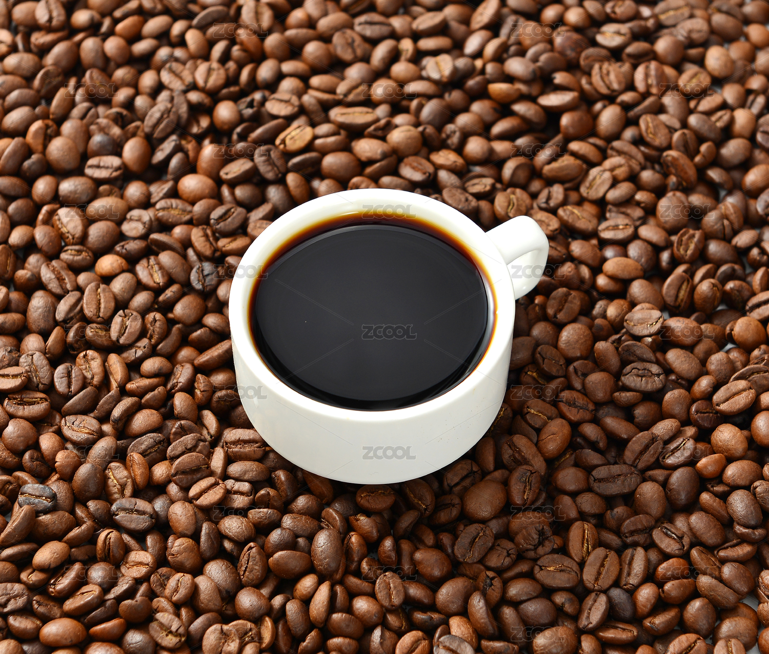 一杯泡好的黑咖啡和灑落的咖啡豆