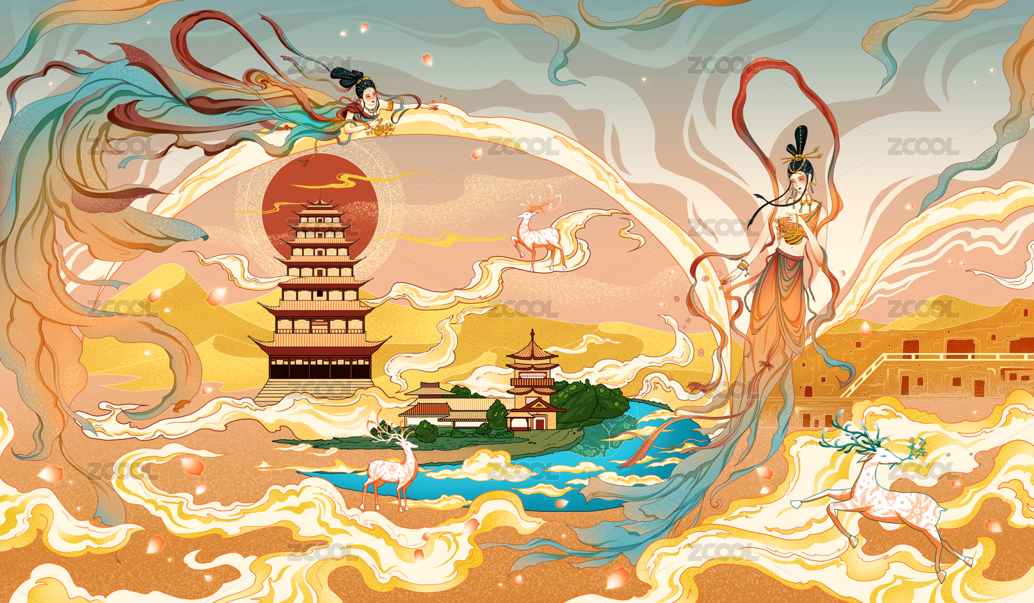 敦煌飛天金色調(diào)國潮創(chuàng)意插畫