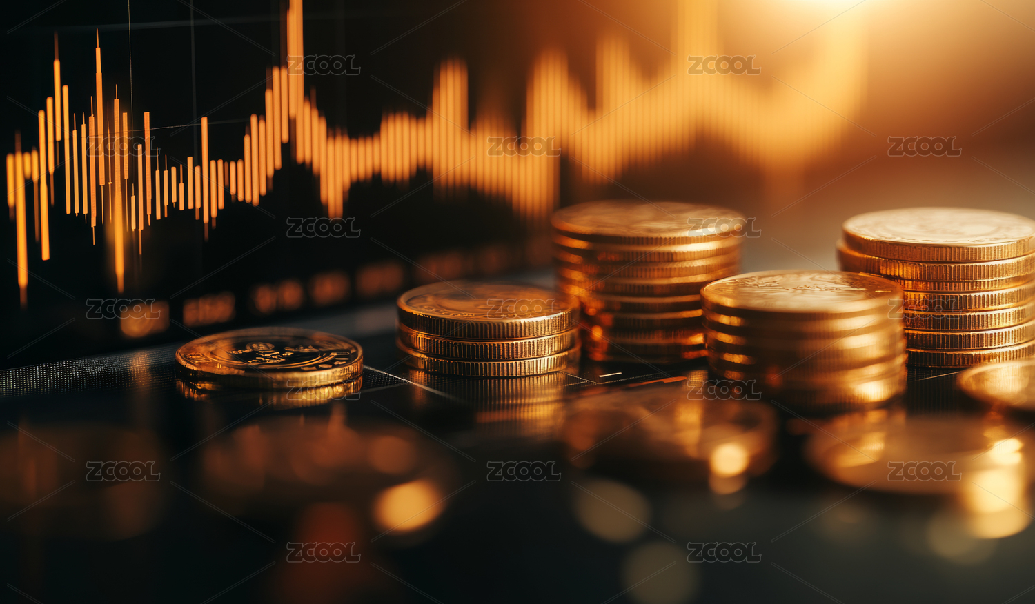 一堆金條和一個(gè)顯示股票市場背景圖