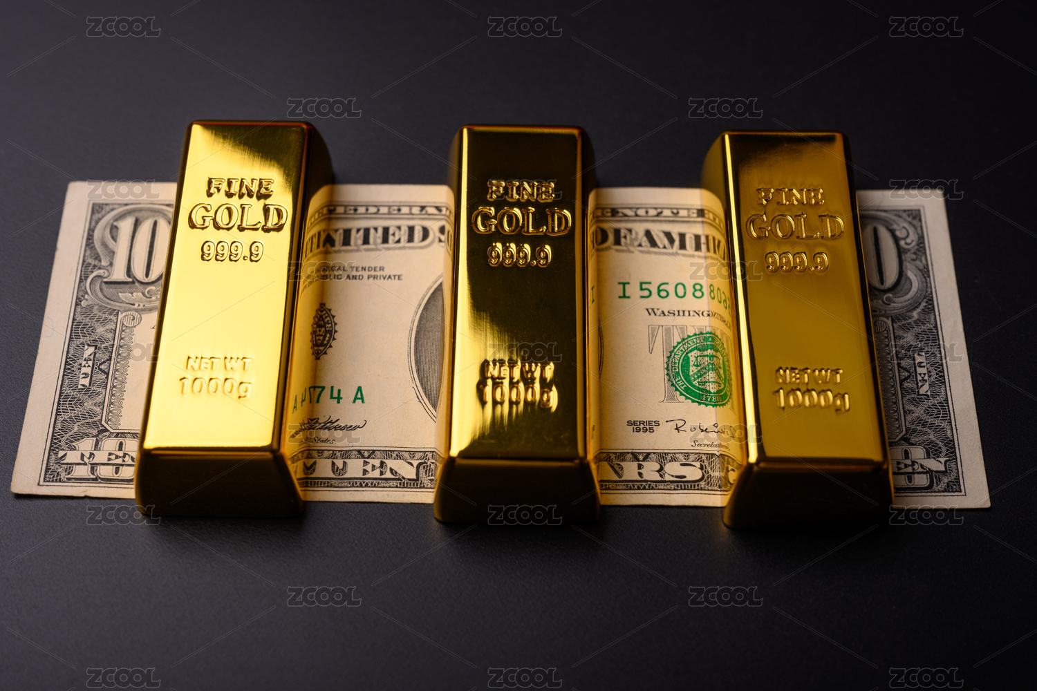 在黑色背景上放著的美元和金條